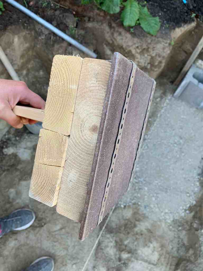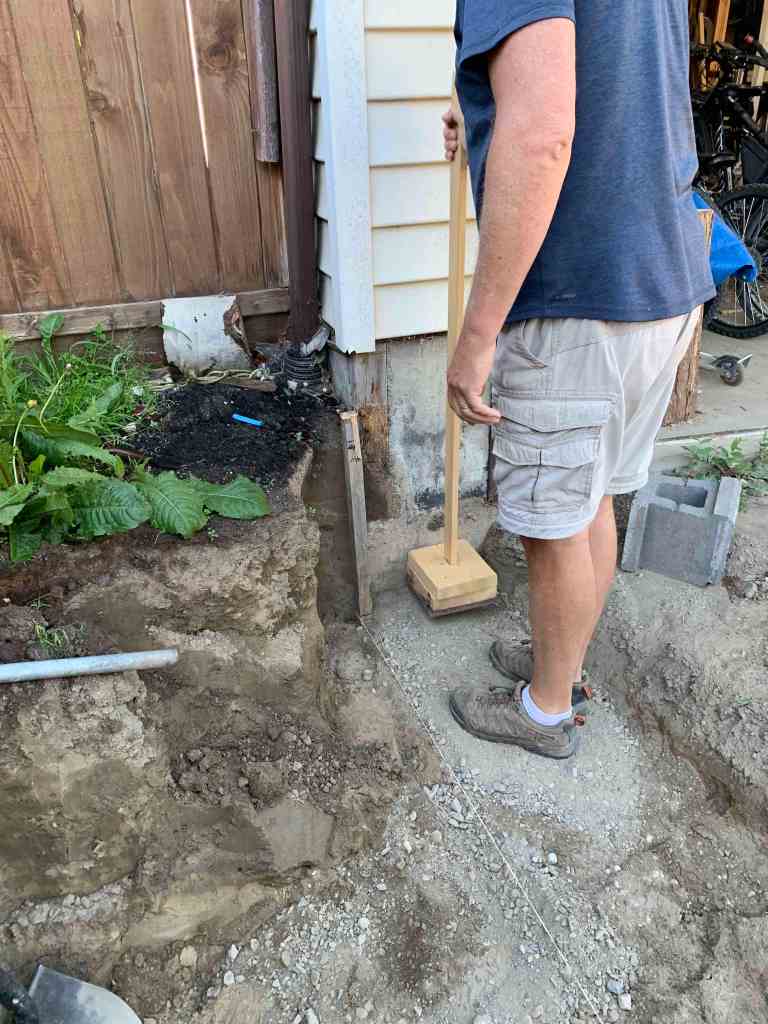 The first day was just dad and me. Dad had all the bricks and tools we would need, including his own built tamping tool for the gravel. I love this about my dad. Rather than buying one that he likely will not need again after this, or if he does need, will be minimal, he made himself one. He had a piece of metal in his shop that had been in his way for years. He commented that he just about got rid of it a few months ago when he was organizing the shop/garage, but decided to keep it. He created a base with handle, and then attached the heavy metal plate to the bottom for quick and easy tamping. Worked as well as the one that Kurt and I bought years ago when we first started building our walls. I love the creativity and that he’s my dad so I have to have some of those ingenuity genes!