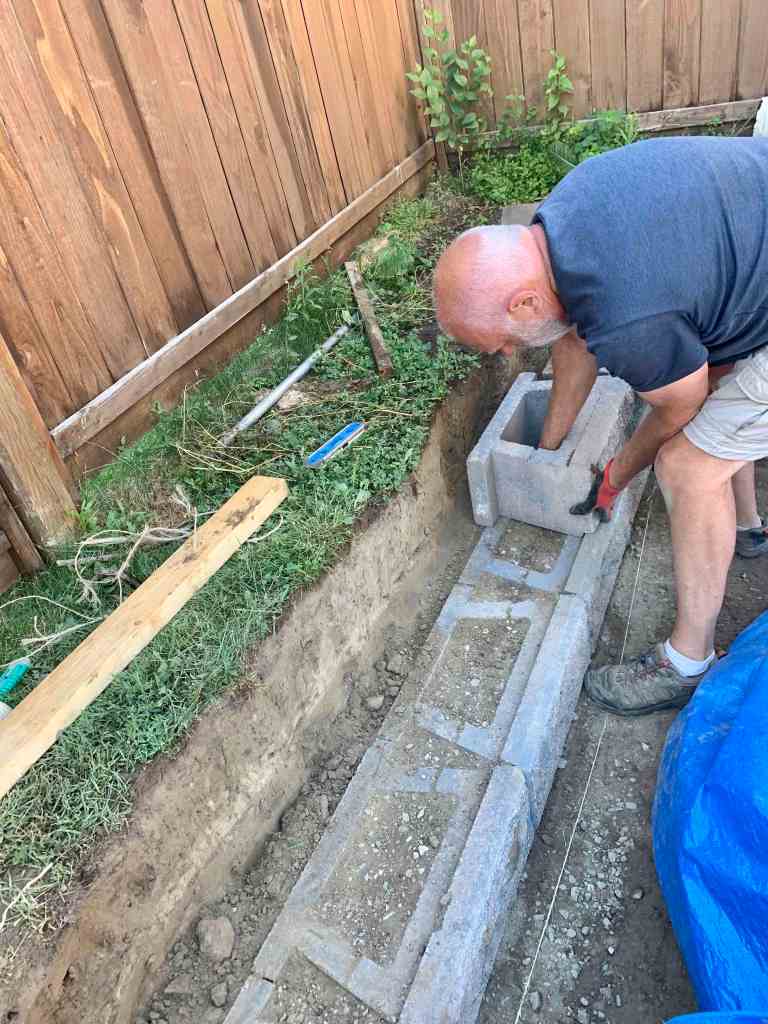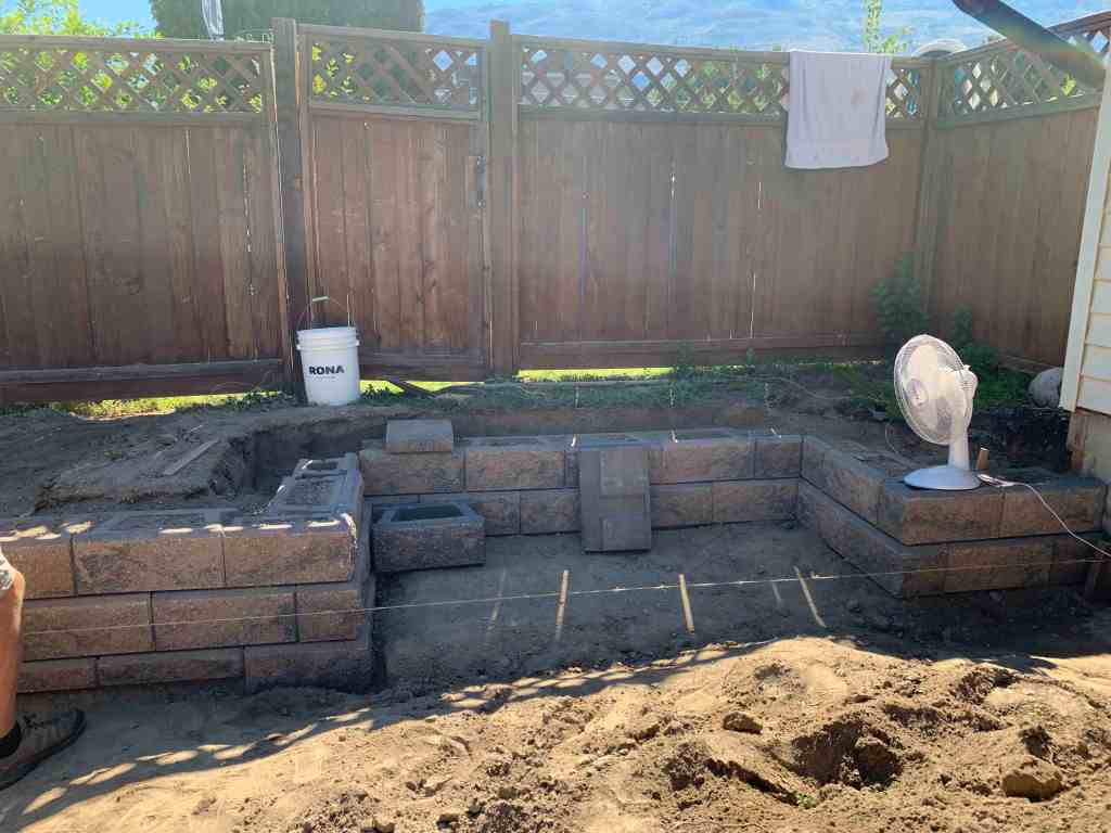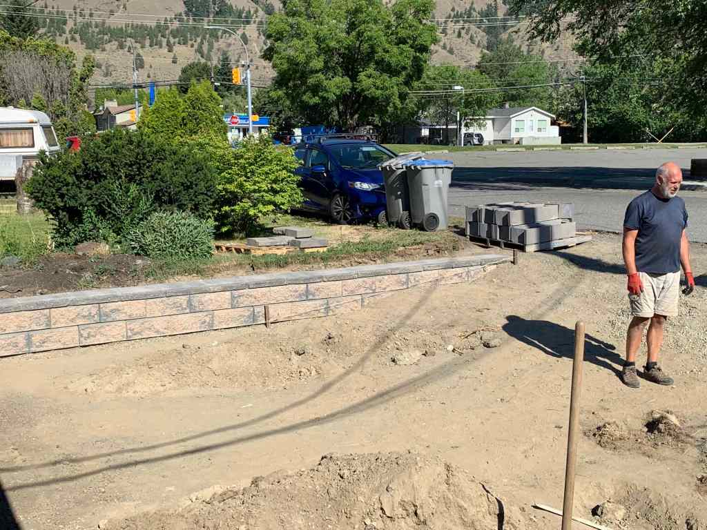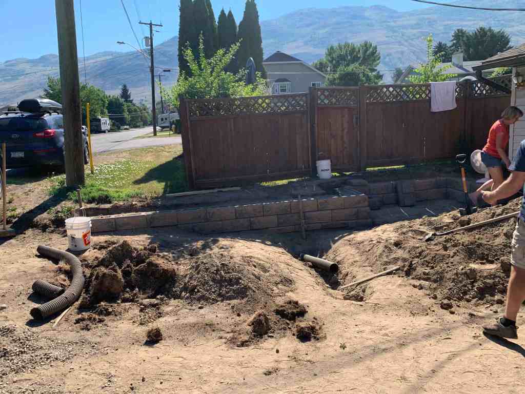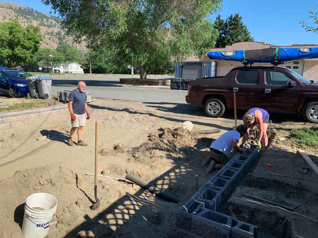The fun thing about helping on this wall is that starting on the weekend and lasting into this week, we are hitting extreme high temperatures and setting new temperature records for June. FUN! The good thing is the work area is in the shade until about 10 am, so we agreed at we would work from 6 am – 10 am and then call it quits for the day. Seems completely reasonable and worked out really well, even though temperatures were reaching into the 40*C plus range for the day, the mornings were manageable enough to get a solid 4 hours of work in. It was a much better system than the one where I had him helping me re-do our deck in the same sort of heat for the full day.
