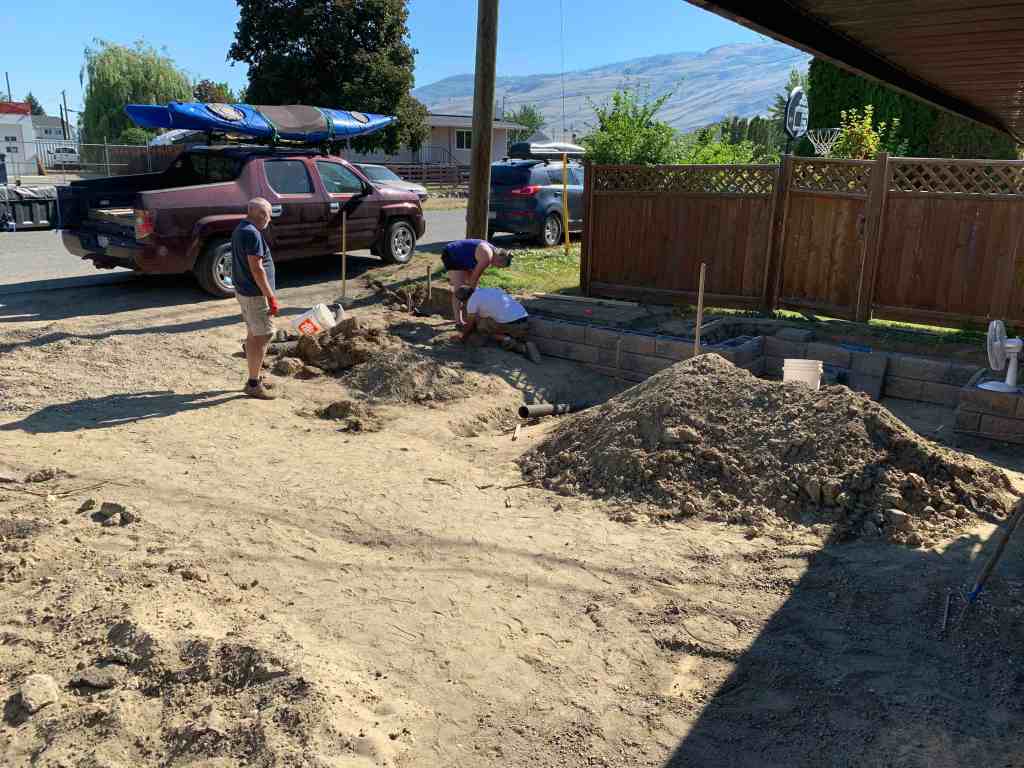 Our parents have been so helpful in some of the projects that we have done in our yard. Both my parents and Kurts dad were here in the spring helping us build our fence. Last year, my dad come and helped me re-finish our deck in preparation of a company covering it with duradeck. They are always quick to say yes when we ask for some solid manual labour. So when it was my parents turn to do a major project, we were quick to say yes to helping. Unfortunately Kurt hurt his shoulder earlier in the spring and the type of work we were doing wasn’t going to be good for it, so he had to sit this one out.