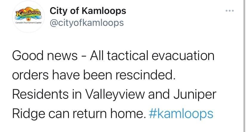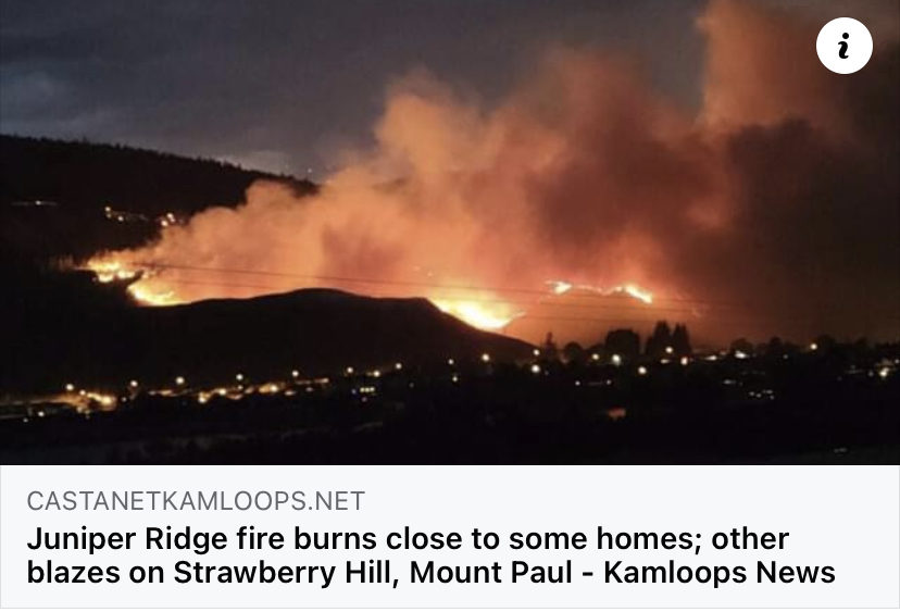The good news is that the fires on the mountainside across from our house are officially out. The fire that threatened houses in Juniper and Valleyview are officially out. The only fire that currently is close to Kamloops is the Sparks Lake Fire which is out of control, and it is heading in the other direction. Unfortunately, it is threatening other communities and many have been evacuated.