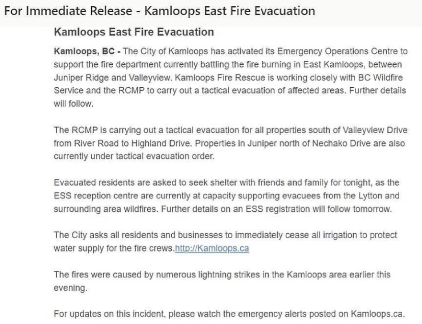Then we saw it. Smoke rising from the other side of another mountain range that is between us and another valley of Kamloops. There was also a glow that was unmistakable. We had been lucky with our fires. Although there were 3, they stayed fairly small and the fire crews had reached them quickly. For a moment I though, nah, it’s just because it is getting darker that it looks worse. But I was deluding myself. Social media was lit up with photos and comments. And it wasn’t the worst of it. There was another fire in that valley, further down, that was aggressive, fast and unpredictable. It was on a hillside with residential areas below and above. Threatening. The residential area above has one road….just one that allows residents in and out…to escape. Like a climactic part of a movie, the heroes sprung to action. The City, BC Wildfire Services, Kamloops Wildfire Services and RCMP started a tactical evacuation. They made the decision quickly, not taking any chances after what happened in Lytton.