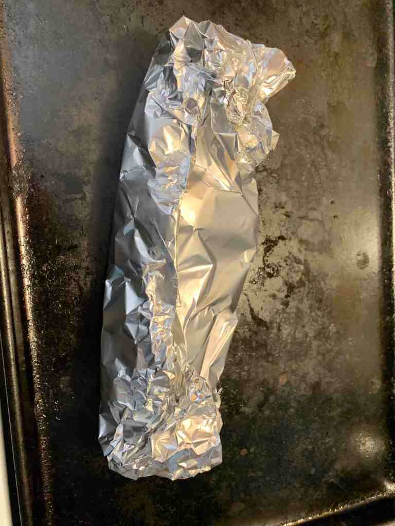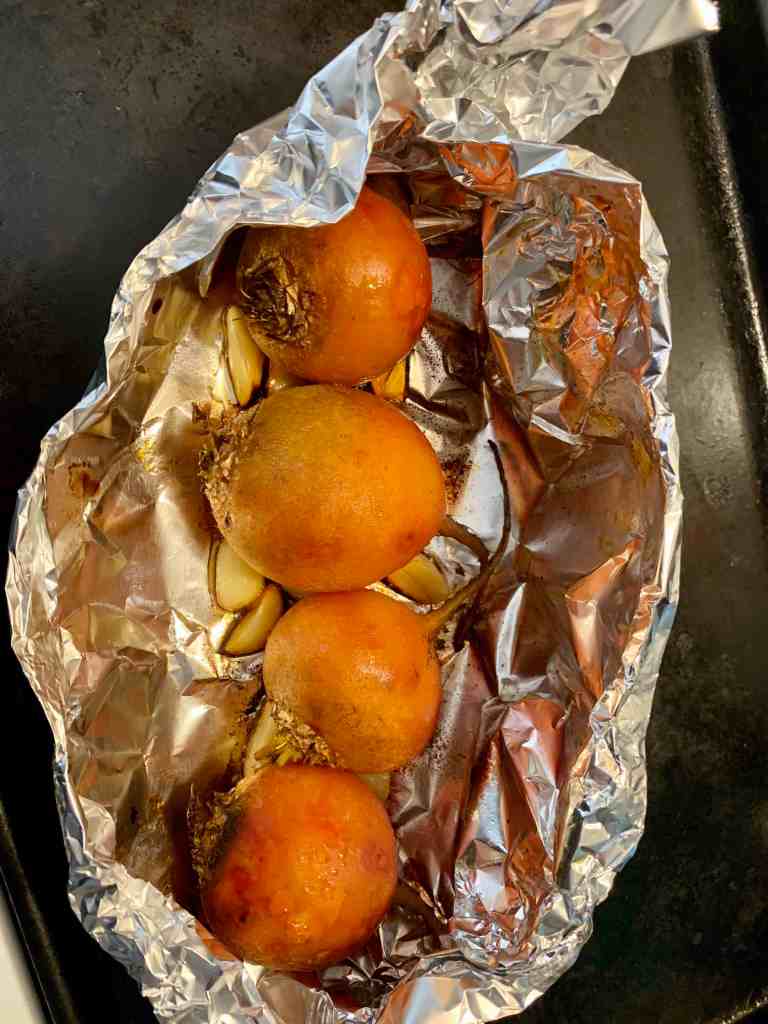 - Fold the foil closed around the beets and garlic and roast on a pan in the oven for 30 minutes. Flip packet half-way through cooking so that there are no dark marks on the beets.