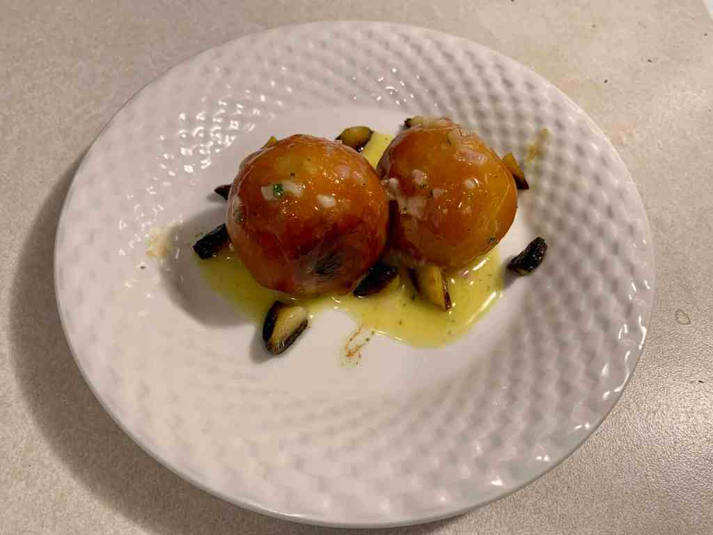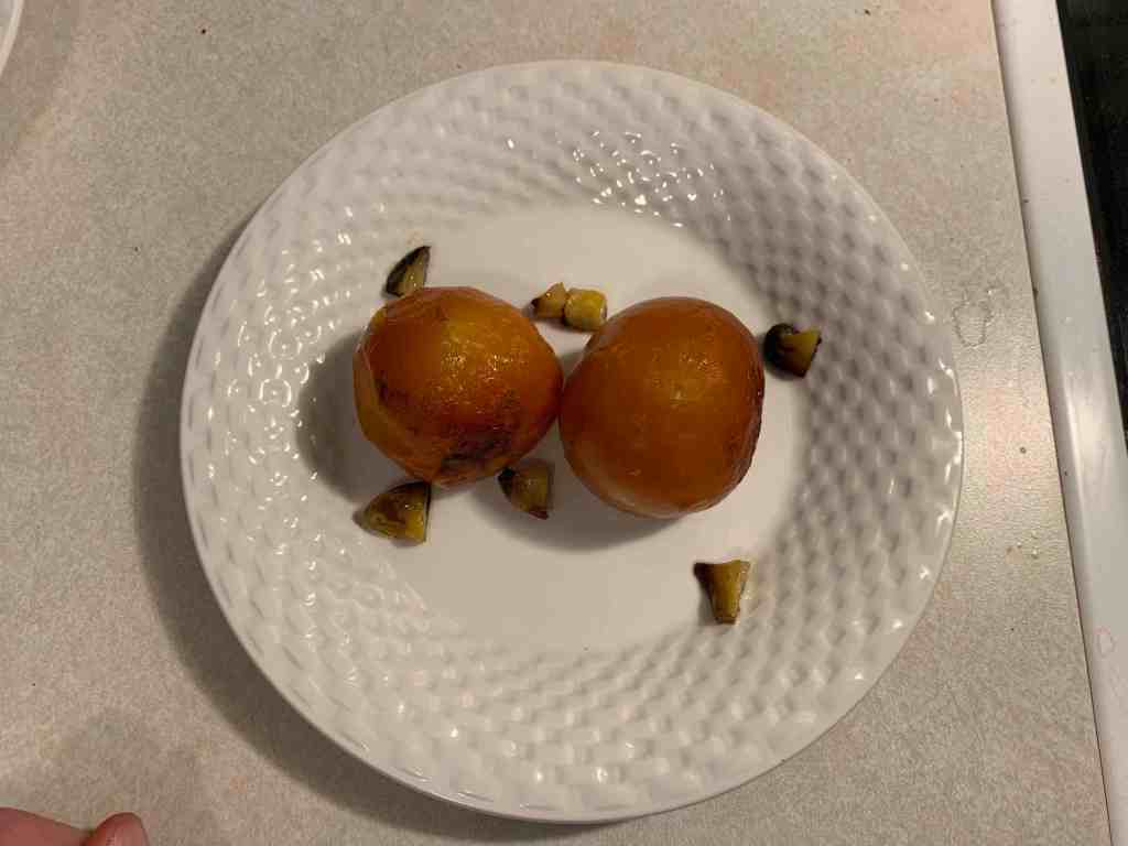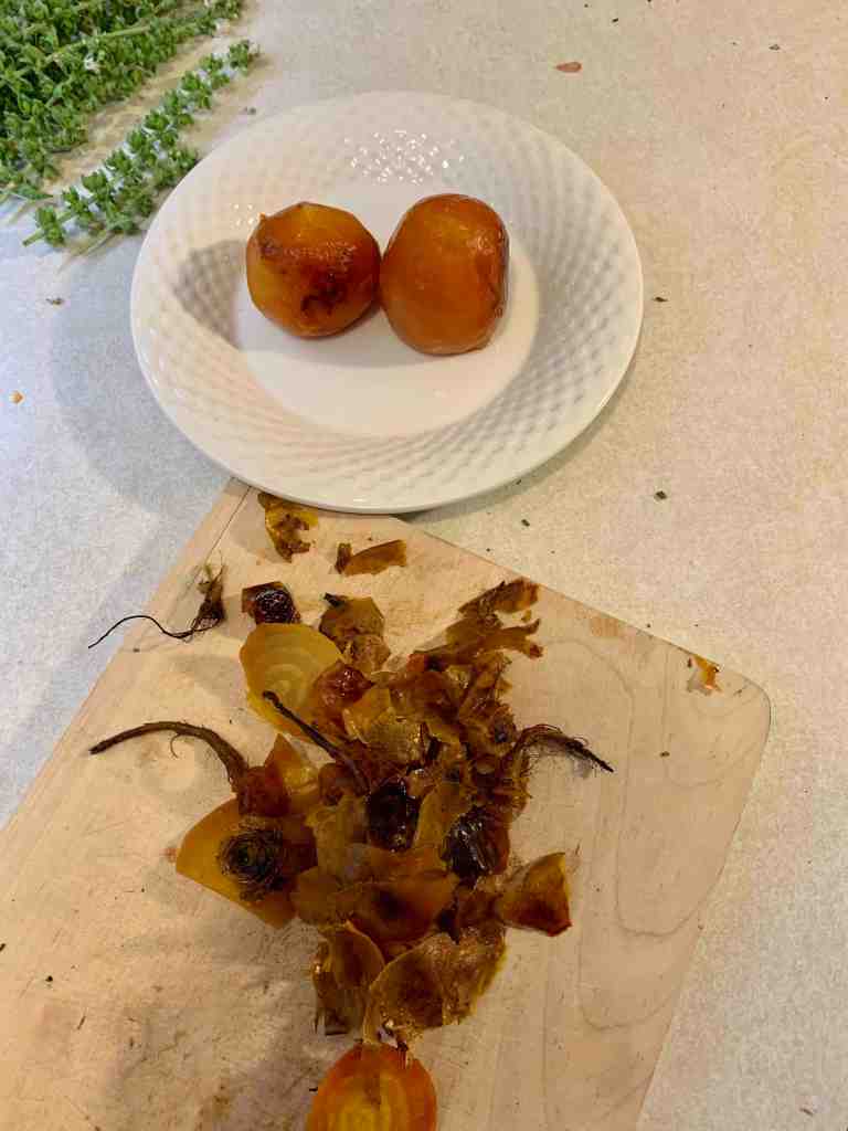 - Place 1 – 2 peeled beets (depending on size of beet) on each plate and lightly drizzle some of the vinaigrette over it. Place the roasted garlic cloves on the plate around the beets.