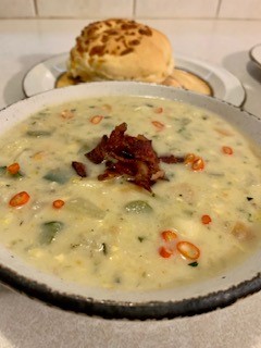 Dish up the chowder and garnish with bacon and cayenne, or any other toppings you would like. Enjoy!