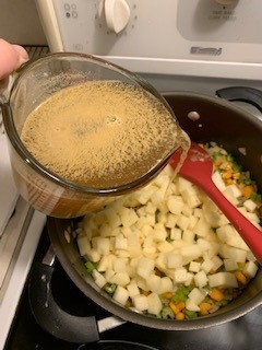 Raise the heat to medium high and add potatoes, water and bay leaf. Bring the pot to a boil then lower to a simmer for 8 – 10 minutes or until the potatoes are half cooked.