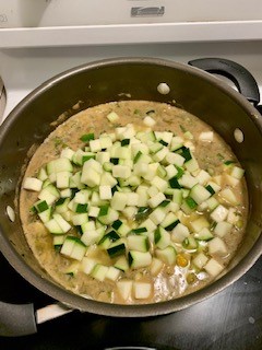 Add zucchini and corn to the pot. Season with salt & pepper to taste. Continue to simmer until the vegetables are tender, approximately 8 – 12 minutes.