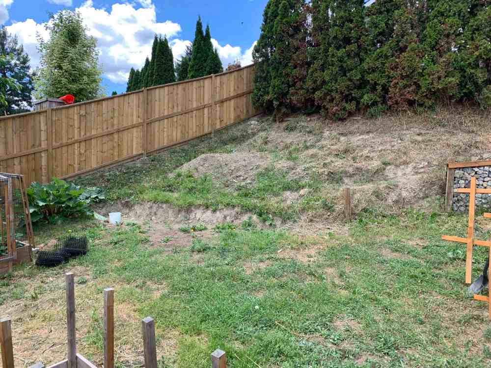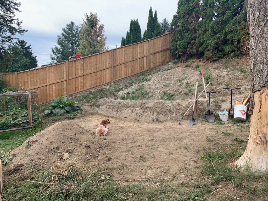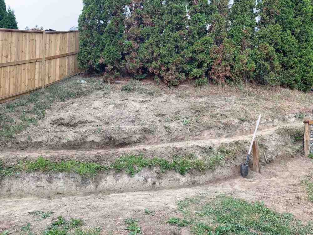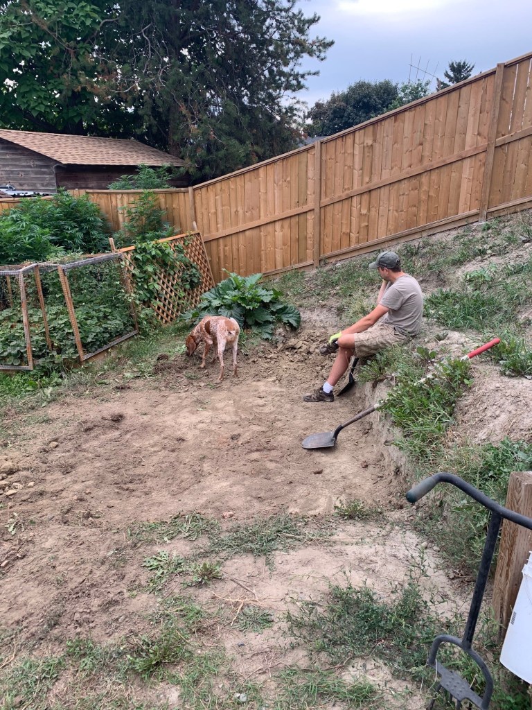Where I had issues is the path that comes down from our top level. As we dug down, we also needed to fan out the base of the path so that it blended and didn’t just drop into the yard. My lack of finesse was a little frustrating, but Kurt did a great job of showing me how he uses the shovel to scrape those slopes as best as he can and then uses the rake to finish it off. There will be more tweaking to do to that area as we still need to take the tree stump out, but we may create a set of permanent stairs down the side of the garden beds then have the path fan out to those steps. We may or may not get that tree out this fall….more likely to happen in the spring.