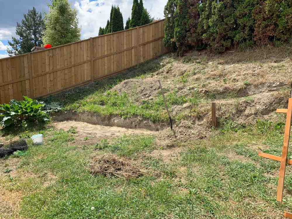 In the spring, Kurt had started to dig the first level on the steep side of our yard. He got the first level dug and was starting on the others when the heat hit. So, that is where we decided to start. We realize that we will not be able to dig out all of the levels at once and then build the walls like we did on the other side. This side is too steep so it will be best it we start at the bottom and build a wall before we dig and build the next. This will give us some flat area to stand while digging and building, but will also support the ground as well.
