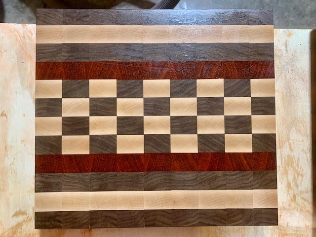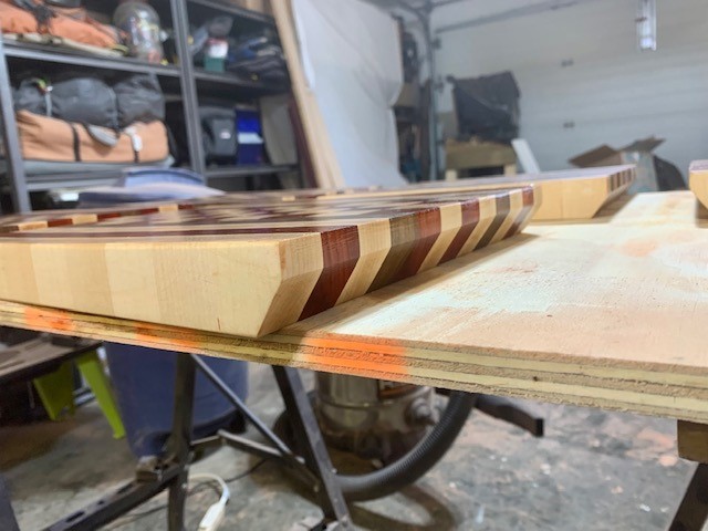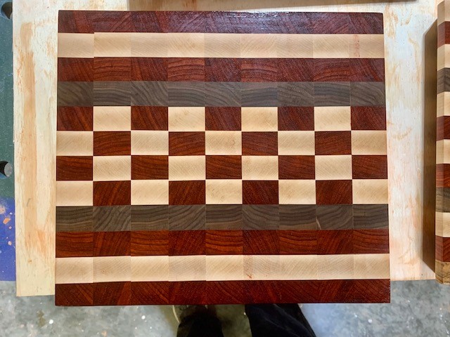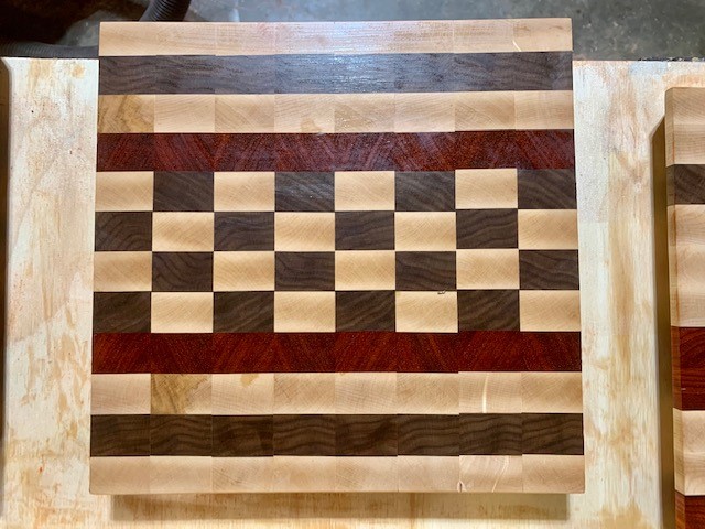 On top of that, I have really gotten into cutting boards. I have already sold a few and have had great feedback on them. I have been giving Kurt notice that the boat needs to be moved out of the shop so that I can get some more boards made. A few weeks ago, I pushed it out for the day so that I could get some wood cut and ready to go for one of my patterns. Over the last week, I have managed to get the first glue-up done. They are end grain, which means they get cut and glued twice so that the super hard end grain is what you cut on. It also makes for some really beautiful designs.