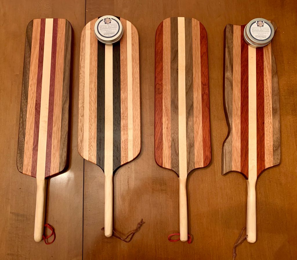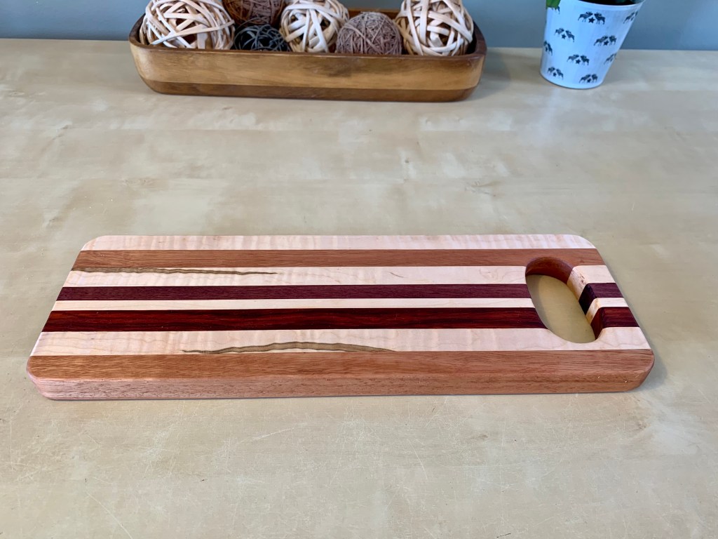I have also explored making some smaller charcuterie boards. Some are standard rectangular boards, and a few I made into a paddle shape. Luck of having some scraps and not wanting to waste any of the wood. I ended up with some long sections of maple that made perfect handles. I love the look of the paddles and will definitely make a few more of these. They make for a fun serving dish. The next batch with be a little wider, with the handle being a little shorter, allowing for the board to be a little longer. More charcuterie room right!