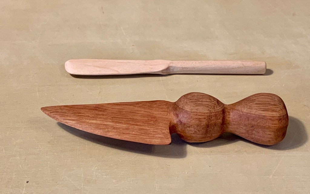 Earlier in the summer, I finally got around to making some charcuterie knives. It was a fun project and I plan to make a few more designs now that I have more space to work with in the shop. I would also like to try out a few larger cooking utensils like some spatulas. I think it would be a neat packaged option with a cutting board and some matching cooking utensils. The knives were my first crack at some sanding as well as some carving. Luckily, I had a good teacher for the carving portion, so I was able to come up with some fun designs.