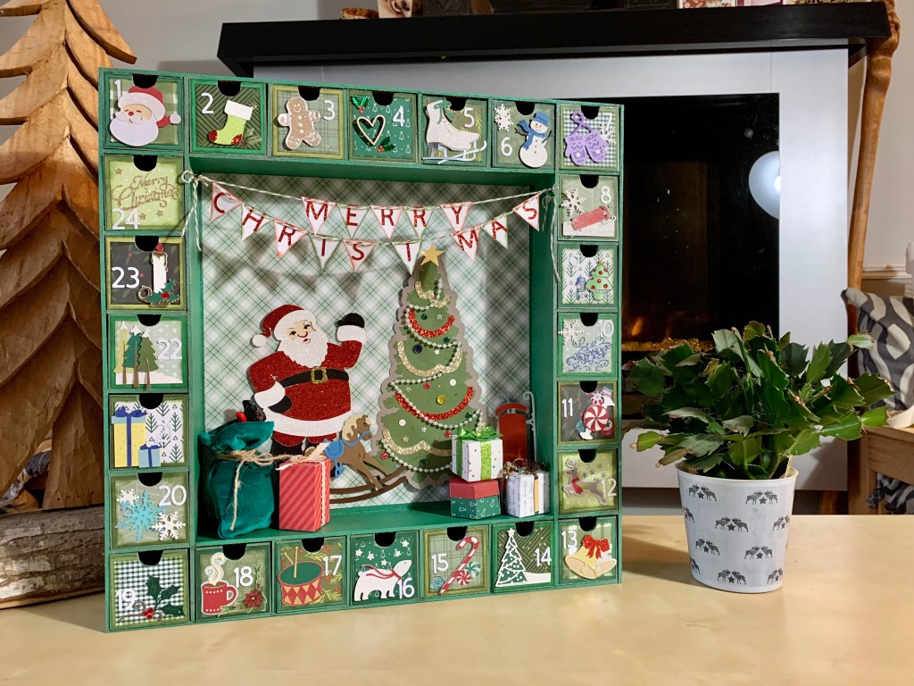 I once again, have a spare calendar made, so my dad and I are teaming up to do another calendar together, with the centre feature being one of his carved plates. This time we went more whimsical with bright green and red colouring for the frame and boxes. The plate showcases the same red and green colours for a more vibrant display.