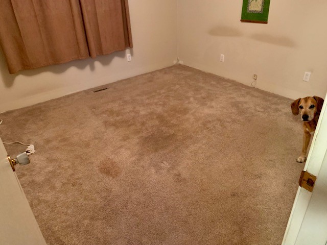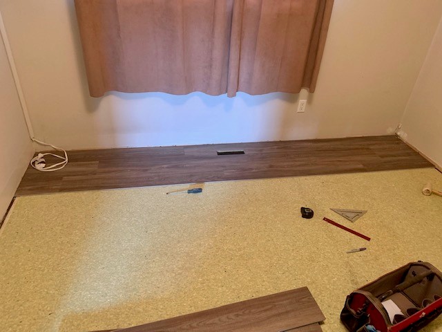 First step was taking the carpet out. To do that, we had to remove our old bed, all the furniture and the baseboards. No problem. The bed frame will be re-homed and the mattress will either go to the dump or my sisters camping trailer. The carpet was fairly easy to pull out, until we reached the closet. The track for the closet was screwed down on top a piece of wood on top of the carpet. Our closet doors are mirrors, and knowing my luck I would somehow break them and have to buy new ones, which I really didn’t want to do. So we took a look at what the flooring looked like underneath that section and cut away the carpet to start. Out went the carpet and we were able to assess what we were going to be working with.