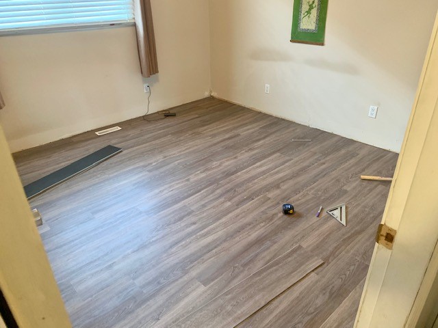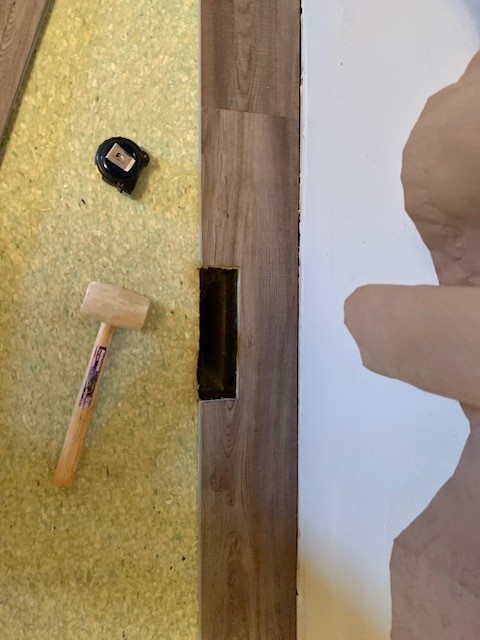 Putting down the flooring was really quick, with little physical effort….other than crawling on the floor and then standing to cut the pieces so that we had overlaps along each row. There is only 1 vent in our rectangular room, so once I had that cut, it was quick work to get the flooring across the room. We did test out the subflooring when we had about 8 rows done. There was a little bit of flex as Kurt walked along it, but it didn’t affect any of the seams, so we finished the room rather than pulling up the flooring to remove the foam sub-floor.