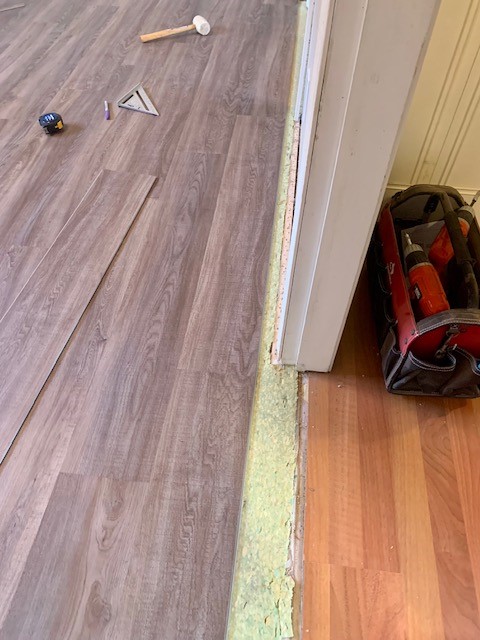 Under the carpet was a solid foam subfloor with the spikey strips of pain around the perimeter to keep the carpet in place. Walking on the foam subfloor, we noticed there was very little give, so we decided to take a risk and put our new flooring over top of it. I liked the idea of the sound-proofing that the subfloor provided and the tiny bit of give shouldn’t affect the vinyl plank connections as they have a bit of flex to them, unlike the old wood laminate flooring. We may come to regret this decision, but so far I am happy with it. My dad did swing by for the post hole digger and warned that he had some issues with an underlay on one of his floors making some of the planks separate, but those were the wood style laminate flooring, not the vinyl planking.