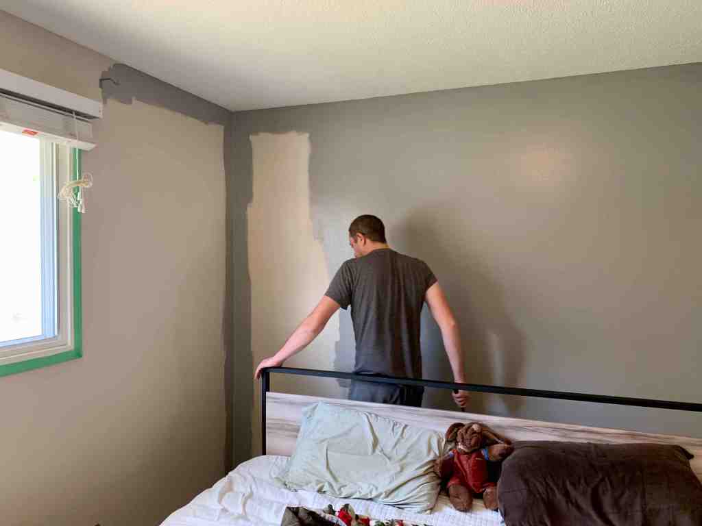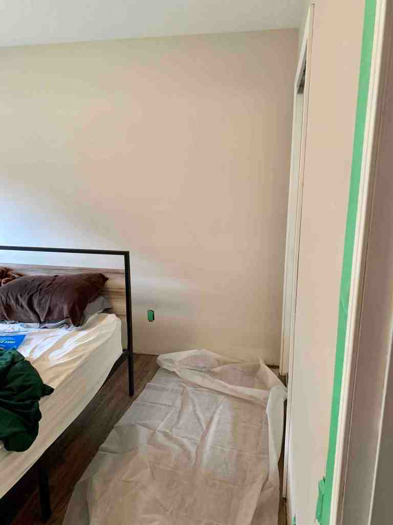 Back home we went with all the supplies and got ready to go back to work. We got our paint clothes on, put the drop sheet down, added some painters tape along the floor and around the tight areas like the closet and door frame. I didn’t tape the ceiling because we have popcorn ceiling and I find the paint just finds way under the tape on that so I just trimmed the ceiling with a paintbrush. It took a bit before the muscle memory came back and I was a little less nervous about bopping the ceiling. Kurt followed me with the roller coating the walls.