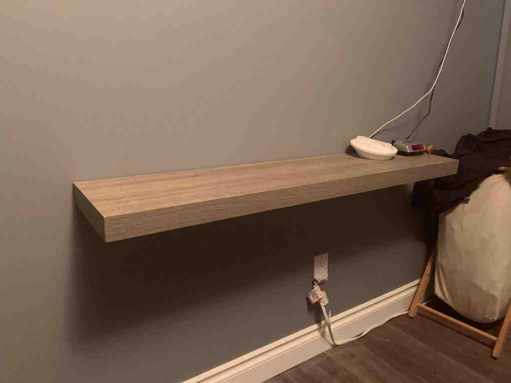 The final addition to our bedroom renovation was some new bedside tables. The old ones were quite large and I didn’t think they would fit nicely with our new, larger, bed in our small room. I had thought about building some smaller bedside tables, but while cleaning out my office one day prior to renovating the room, I found some floating shelves that I had bought years ago. I can’t even remember what my plans had been for them. Possibly some shelves in the washroom and they ended up being too long. Either way, they had a nice grey tone to them, and I thought they may look nice as our bedside tables. Added bonus is keeping the floor space clear for Roomba to do its thing.
