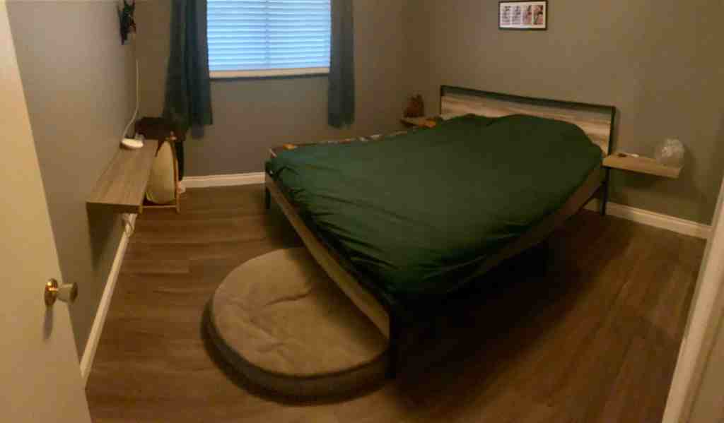 When we were planning a king size bed, we had thought that there wouldn’t be much space around the bed, especially on Kurt’s side since my side of the bed has the closet and we wanted to leave some space to get items in and out easily. I was a little worried that the floating shelves may be too long to go on both sides of the bed. So once the paint was dry, I started doing some measurements and realized that there would be plenty of space for them, and leave room to get in and out of the closet easily.