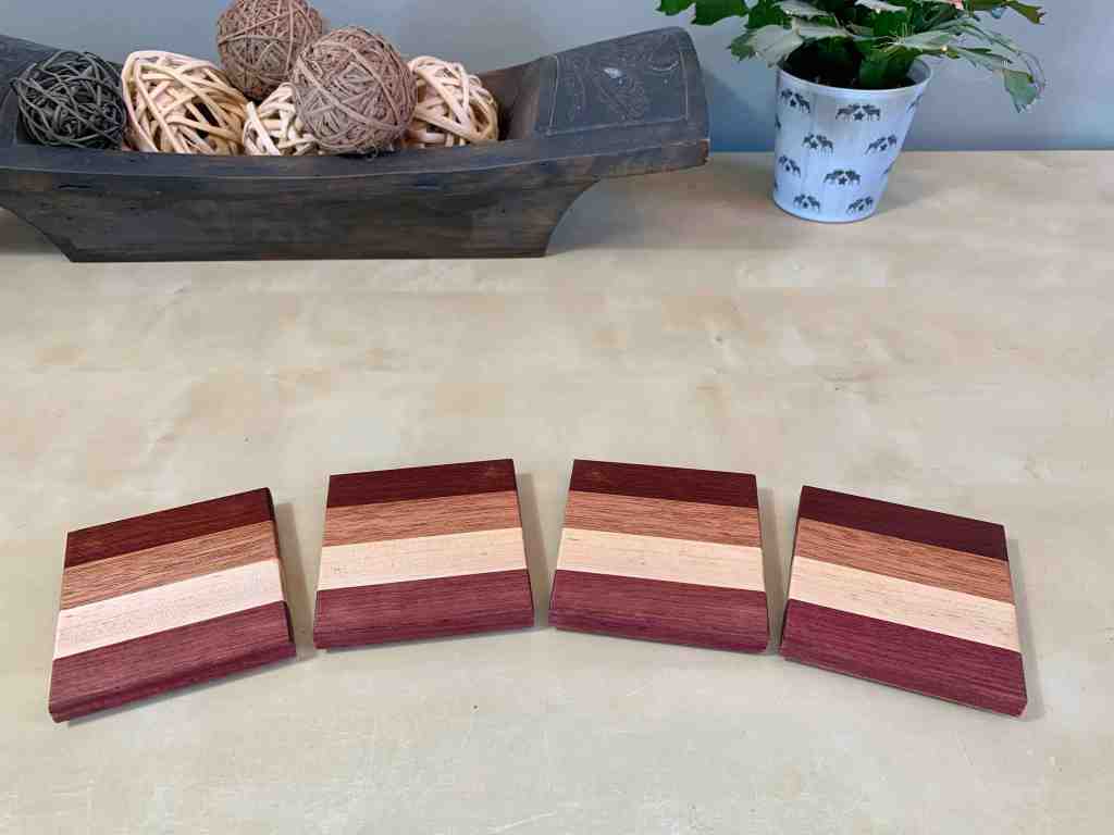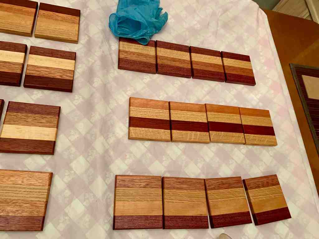 To add to the baking, I decided to try out one of my shop list items. I have been wanting to try making some coasters for a bit now, so I decided it was time to try it out. I went with a fairly simple design of stripes. Since I plan to put these in my shop as well, this pattern let me figure out how long it takes to make a set, as well as how much material is used and the cost to make them. I was pleasantly surprised to find out that they were pretty quick to make, and I can make a lot out of 1 board. I chose a bunch of different woods and cut them into 1″ x 14.5″ x 1/2″ strips. Because I was going for a variety of colours, I ended up with quite the stack of wood to work with. In the end I was able to make 9 sets of 4 coasters. I gave 5 sets away to my coworkers, and the other 4 will go on our Etsy shop. I still have enough wood strips in the shop for another 7 sets of coasters, which is fantastic. All my coworkers really liked the coasters, so it was a double success of learning how to make them, and having great feedback from those I gave them to.