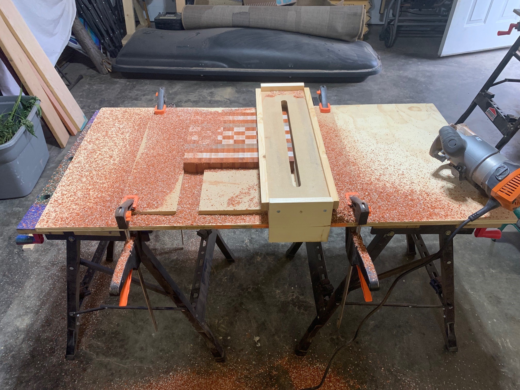 Router jig. Back in October, I had to put together another simple jig due to some issues with my table saw. Poor maintenance had led to some rough glue-ups of cutting boards. I ended up making a jig that I had seen other woodworkers use on end-grain cutting boards, and decided it was time to make one of my own. See, end grain is extremely hard to sand down, especially in hardwoods. To save time, many woodworkers use their router to shave everything down to the same level to help reduce the sanding required. I quickly put one together and I can guarantee is saved me hours of time. My glue-ups were off by quite a bit. That isn’t so much a problem now that I know how to do proper maintenance on my table saw. This jig is also handy on any woodworking piece that is too large to go through a planer, such as live-edge slabs. It is very simple to build and just as simple to use. If you are interested, I have also make a post about how to assemble a quick and simple version of this jig in my post called “Doing a Simple Jig“. You will note that mine will likely be replaced in the future as it was a quick build, but so far it has continued to work exactly how I need it to.