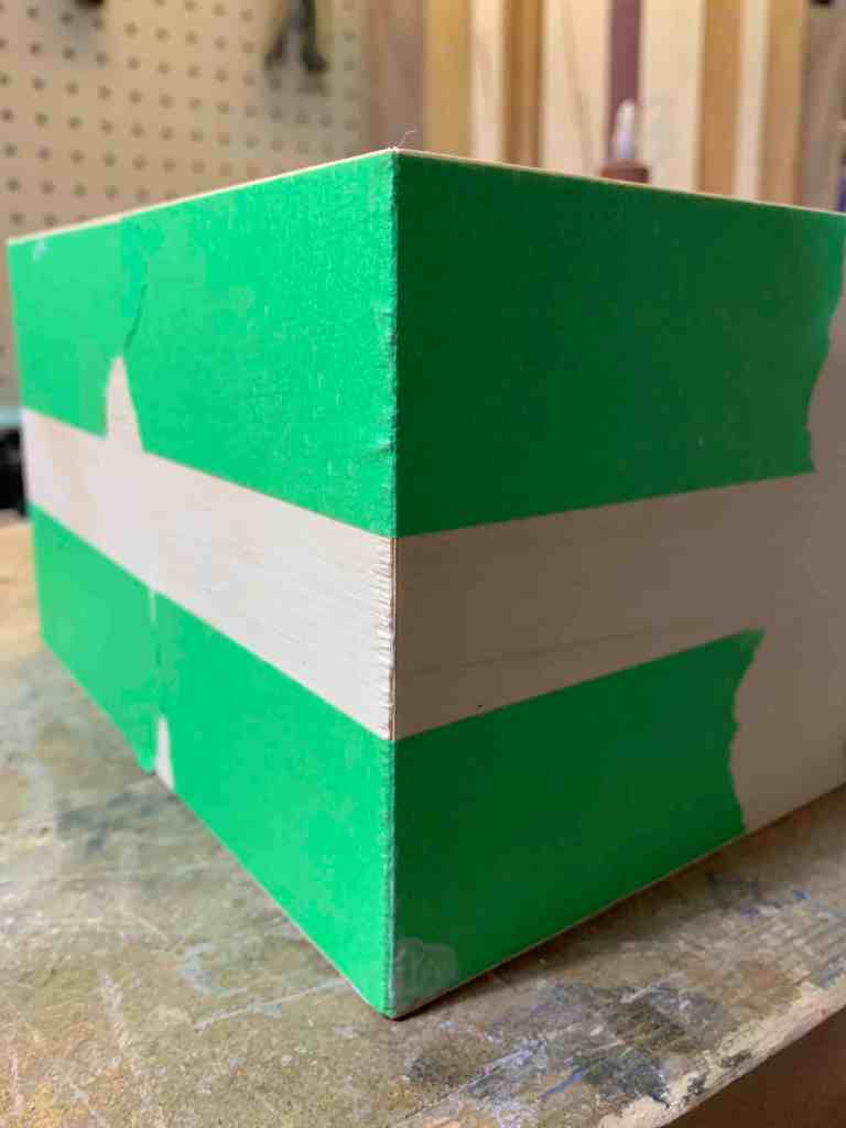Test fitting pieces is also a great use of painters tape. It was designed not to leave residue, so it makes a great tape to trust on projects without the hassle of worrying about having to sand down gooky or stained areas from the tape adhesive. I used this on my lazy susan turning mechanisms because I hadn’t quite figured out how to properly measure the centre. I have since solved that problem, however it never hurts to do a quick test with the tape before drilling holes and finding out that your turning mechanism is off. I also used this trick for a dry-run of assembling a box.