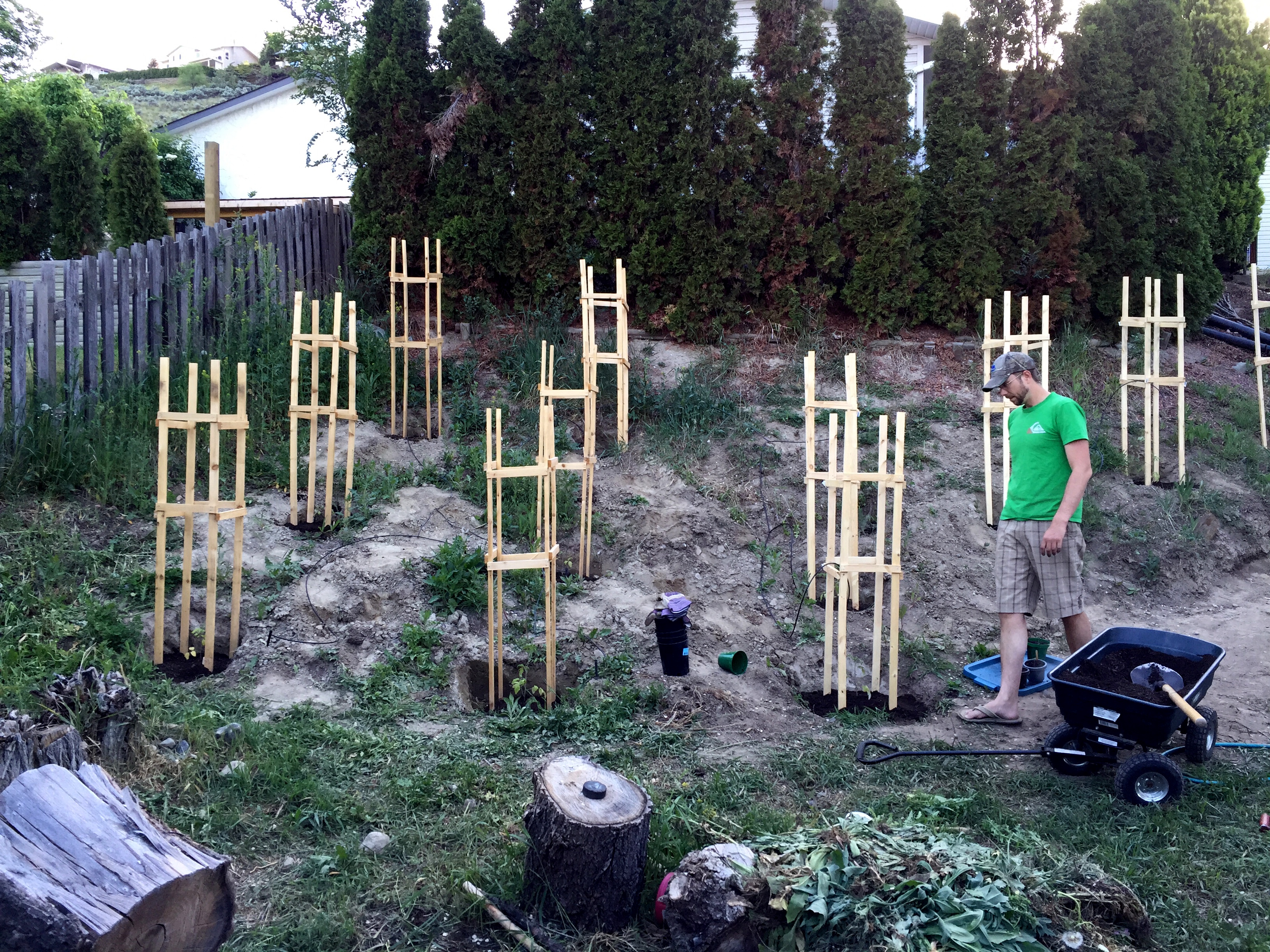 2018 – The left slope continued to grow tomatoes. There was some irrigation work that had to be done to the cedars that sit atop the left side hill. Thanks to Ellie’s perimeter checks, she had pushed the gravel from behind the shop onto the irrigation heads, burying them. The trees began to die due to lack of water. We decided to run the irrigation in the tree and hang it downward to avoid the issue of them potentially getting buried again in the future.