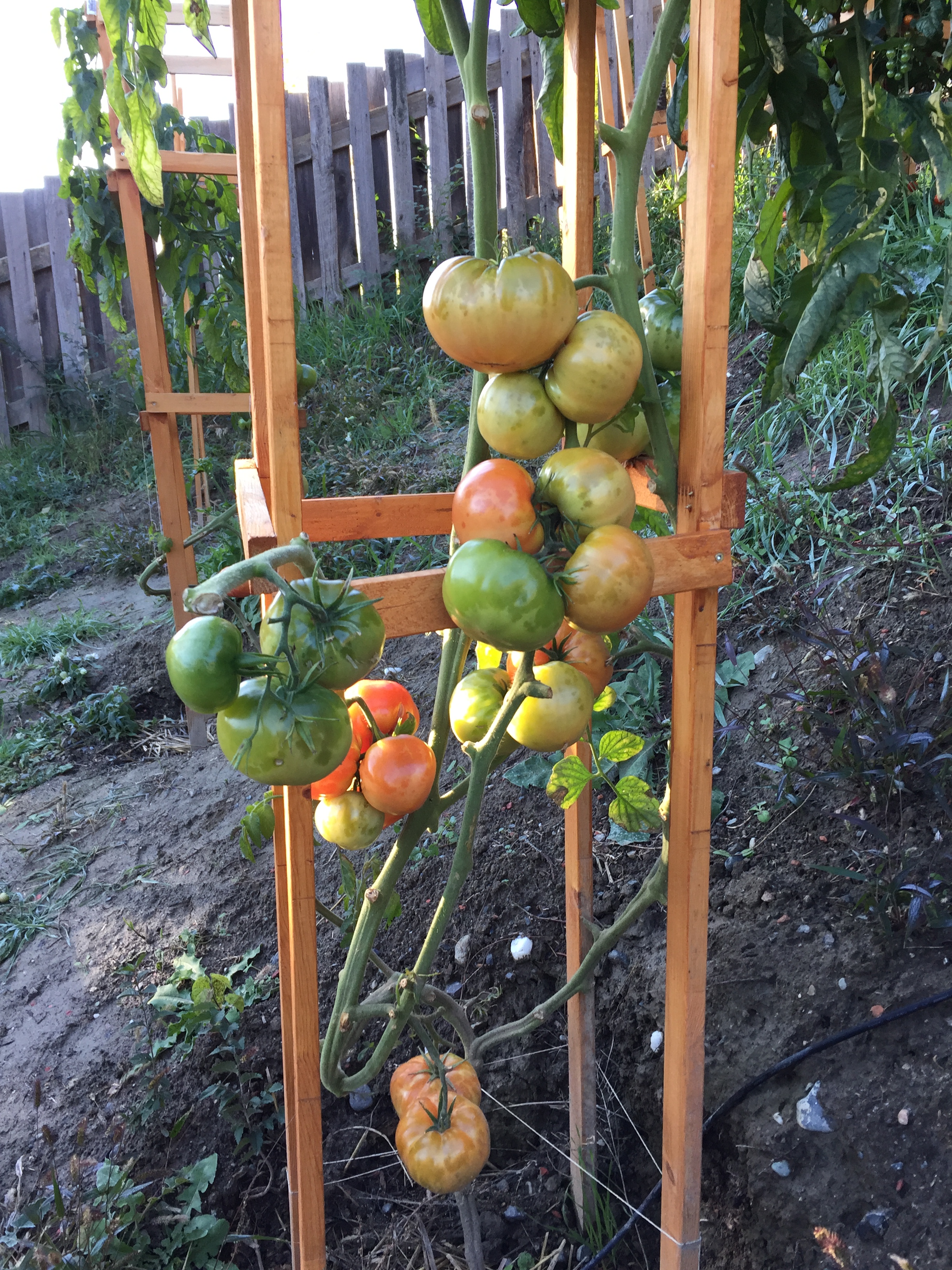 2015 – We will start here as 2013 & 2014 were the same for both sides of the yard. In 2015 we put in our first batch of tomatoes, using the traditional wire cages. We knew very little and let the tomatoes go wild, resulting in a good yield, but very few that actually ripened. We also battled our first horn worm (luckily only ever had the one), and the tomato plants grew so large that they bent the wire cages.