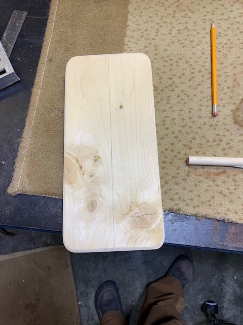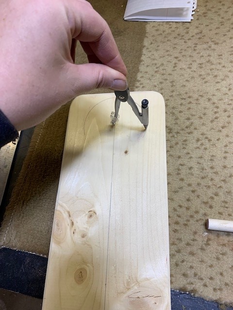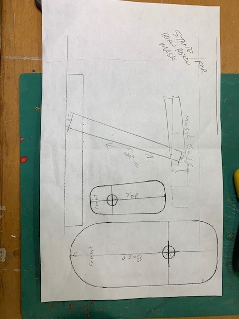 Dad had given me his drawings for the pieces he had designed for his previous stands. It worked well as a reference point for my base. I used some scrap pieces of 1″ x 4″ pine I had from previous projects. it was going to be painted, so it didn’t really matter what wood I used. As you can see from the photo below, Dad had rounded the edges of the base pieces. I cut a smaller piece that fit inside my mask, behind the jaw. I then cut another larger piece for the base. I ended up making it much narrower and rounded than what Dad’s photo showed. I wanted it to follow a similar line to the mask itself, so I measured the width at the widest part of the skull, as well as where I anticipated the end of the base on the skull. I then used my handy woodworking compass and set it to the correct widths to match my measurements. I then drew in some half-circles for the two ends of my base. From there, I connected them with the ruler. This created the shape of my base, which I then cut out on the scroll saw. I gave it a nice sand so that everything was even and smooth, ready for painting.