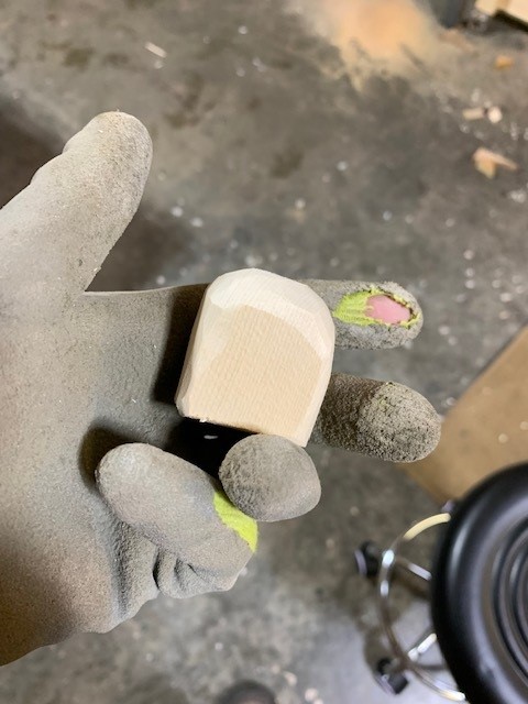 Before starting on the skull, and to give myself time to think about how I was going to carve it, I decided to work on the simple base that allowed me to display the mask with it’s beak open. Dad had given me a few tips from the ones he had made. He had suggested using dowelling for ease of fitting it to the base and the mask. He had used a square post on his first one and it had proved to be a bit of a pain in sitting it in the base. With the doweling we were able to just use the right size drill bit to get the hole to the right size. I always have a stock of doweling in the shop because it can come in handy on so many projects.
