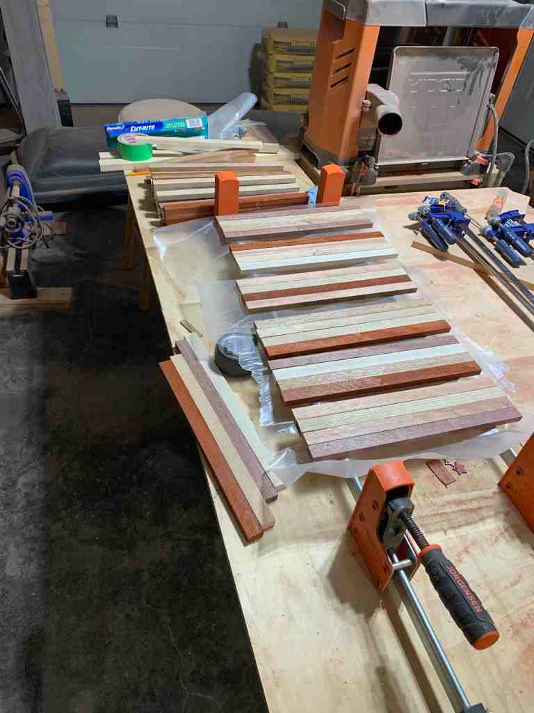 I went with a mix of woods so that I had lots of colours and shades sorted out. I cut 14.5″ chunks of each type of wood and then ripped them down into the strips that I would need. I ended up with more than others depending on how wide the board was. Once they were ripped, I started stacking them together in random orders to make all sorts of different patterns. There were 4 pieces per set of coasters that would need to be glued together.