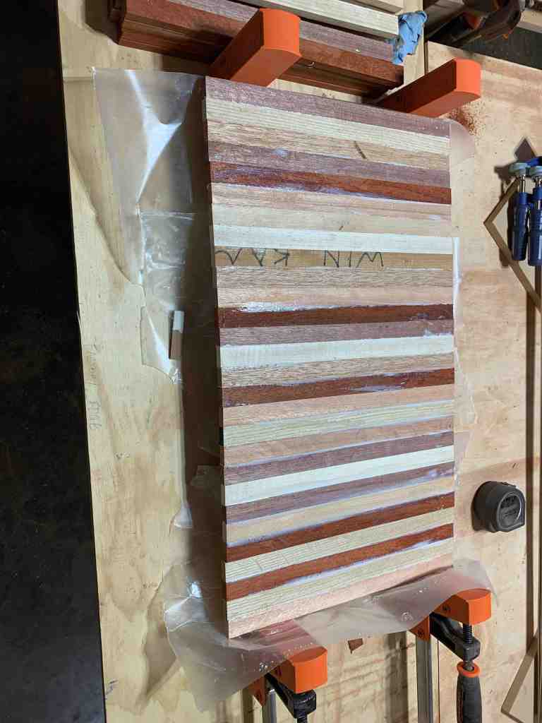The next step could have been tedious since I don’t have a ton of clamps yet….I’m working on that. I didn’t want to glue each set of coasters separately since it would take forever to do all the sets that I had cut. So I decided to put a few sets of coasters in each clamp to see how it would go. I glued the 4 strips of each set of coasters together and carefully butted them up against the next set. When it was time to clamp them together, I tightened the clamps slowly and held a board over it so that none of the non-glued edges would shift against each other or pop out. I was careful to make sure the edges lined up as best I could get them so that I didn’t have to cut much off each end. I also didn’t tighten then quite as much as I would usually tighten one of my cutting boards, just tight enough that the seams were all nice and tight together.