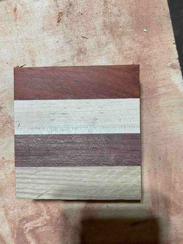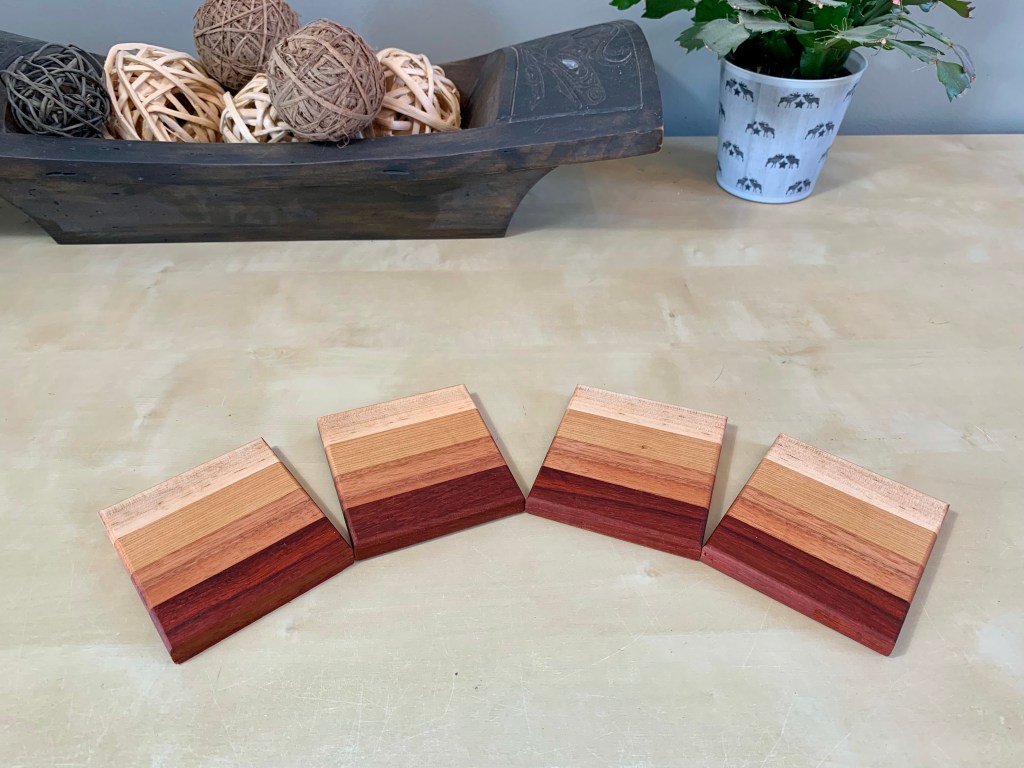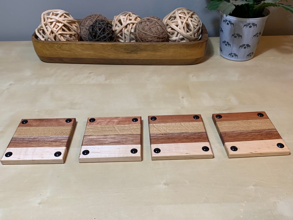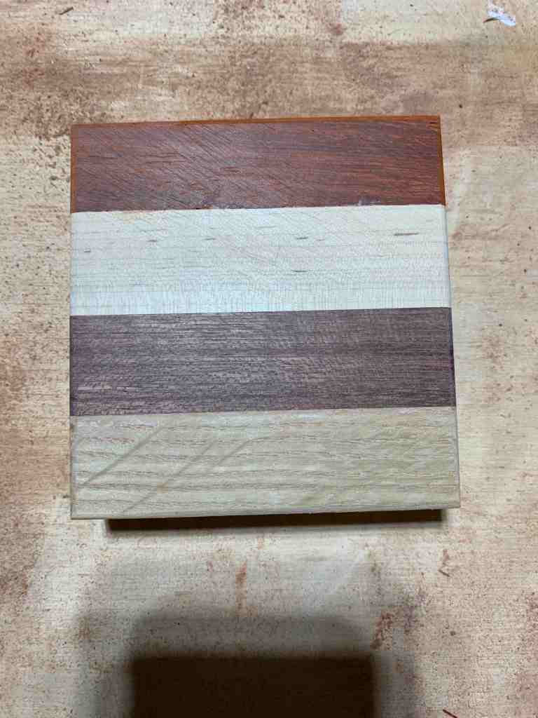 These ended up being much easier and faster to make that I had anticipated. For my first set, it went with a very simple striped design. By going with this style, I was able to make the coasters, similar to how I make some of my cutting boards.