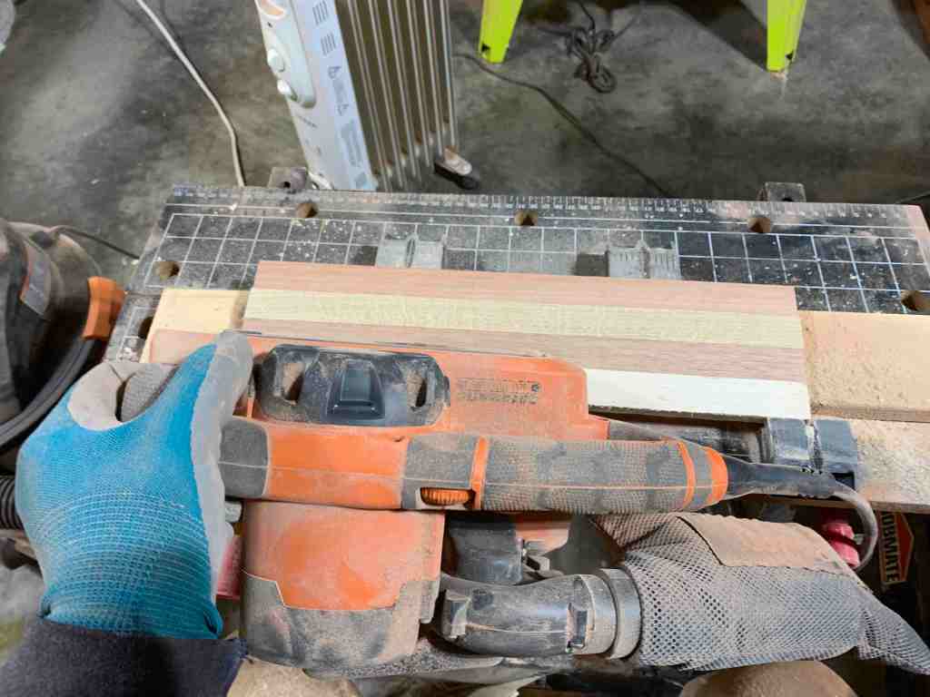 I let the glue cure for 24 hours and then pulled them out of the clamps. I then used my hand-held belt sander with 80 grit and sanded them on both sides, making sure everything was event and there were no lips or pieces sticking up. I then used my orbital sander with 120 & 220 grit to get a nice silky finish to the boards. I found it easier to sand it while it was still a long piece. It was less tedious than sanding 4 individual coasters for each set.