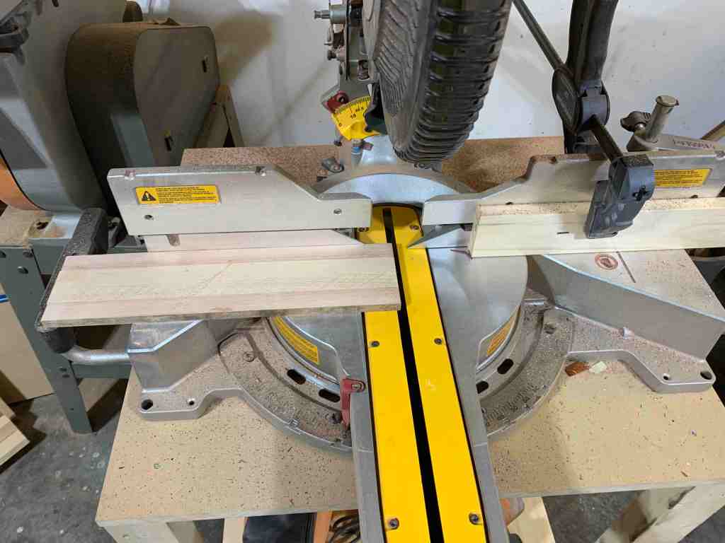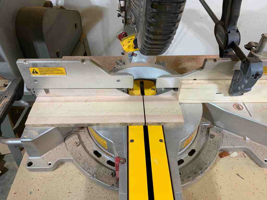 Next I set a stop at 3-1/2″ on my mitre saw. I trimmed the short edges to make sure they were perfectly square, and then used the stop to cut 4 equal size coasters. This created a few rough edges, but that is fine because I knew I was going to round the corners and would have a chance to sand down any imperfections.