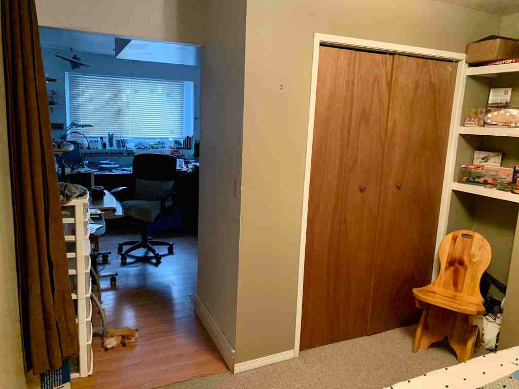 The room also has a little nook with some built-in shelves. Kurt would like me to add at least one more shelf so that he can display some of his hobbies. It will be easy enough to add another. However, while we were priming the room, we discussed possibly finishing those shelves further to make it look more like an in-set shelving unit; give it a more finished look. If we do that, then I didn’t want the inside of the cubby/shelves to be the same colour as the room. So we decided that the shelves and the inside of the shelving unit would be white.