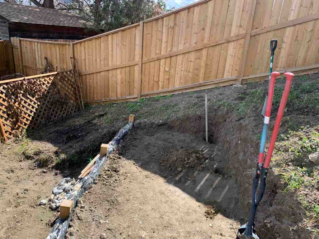 In a post I wrote 2 weeks ago, “And So It Begins Again…“, I had noted that we were starting on the newest wall. We had finally gotten into the yard, and Kurt had managed to back-fill the wall that we had finished in the fall. We were gearing up for getting some posts cemented in and to get working on filling those sections.