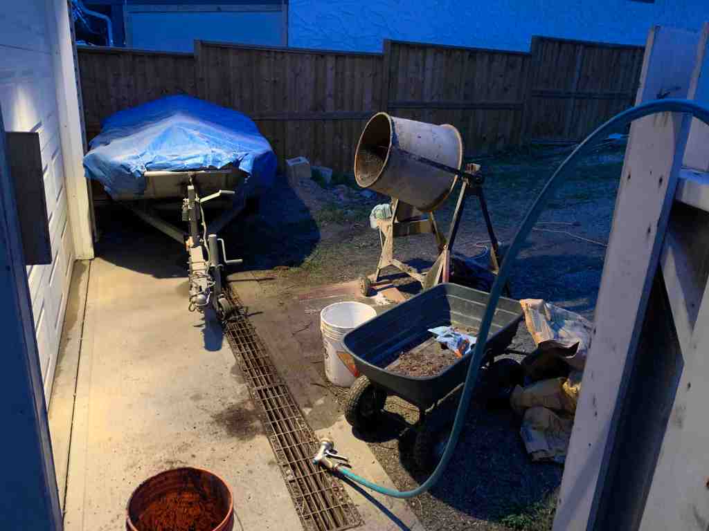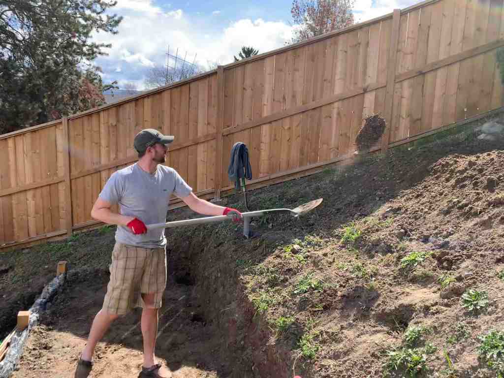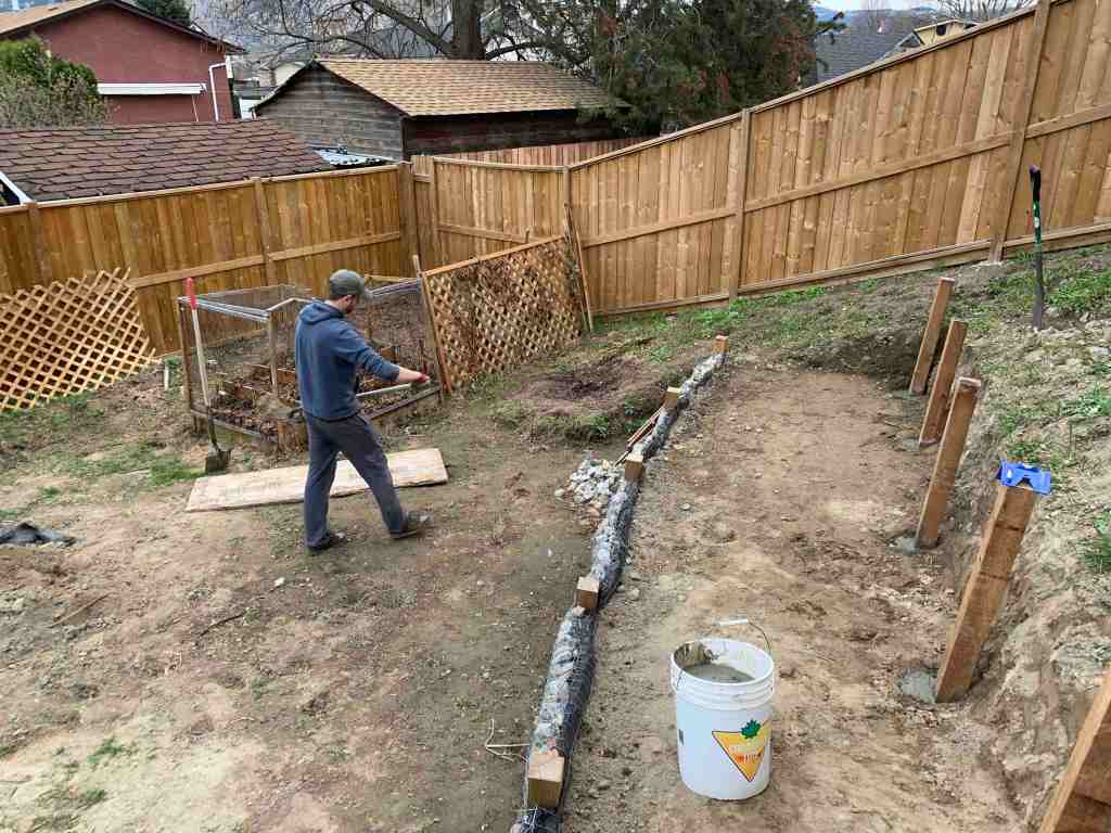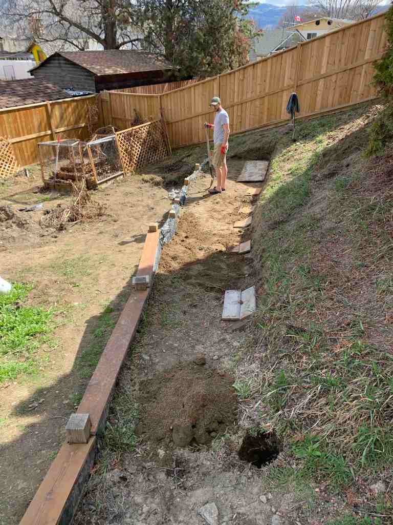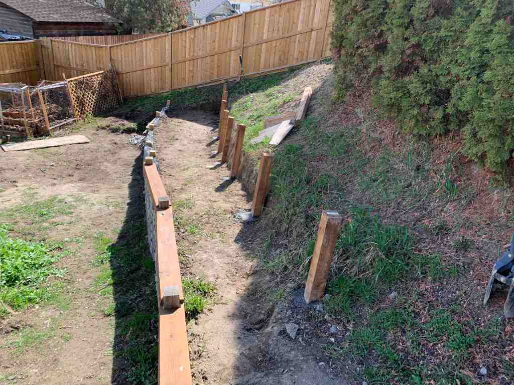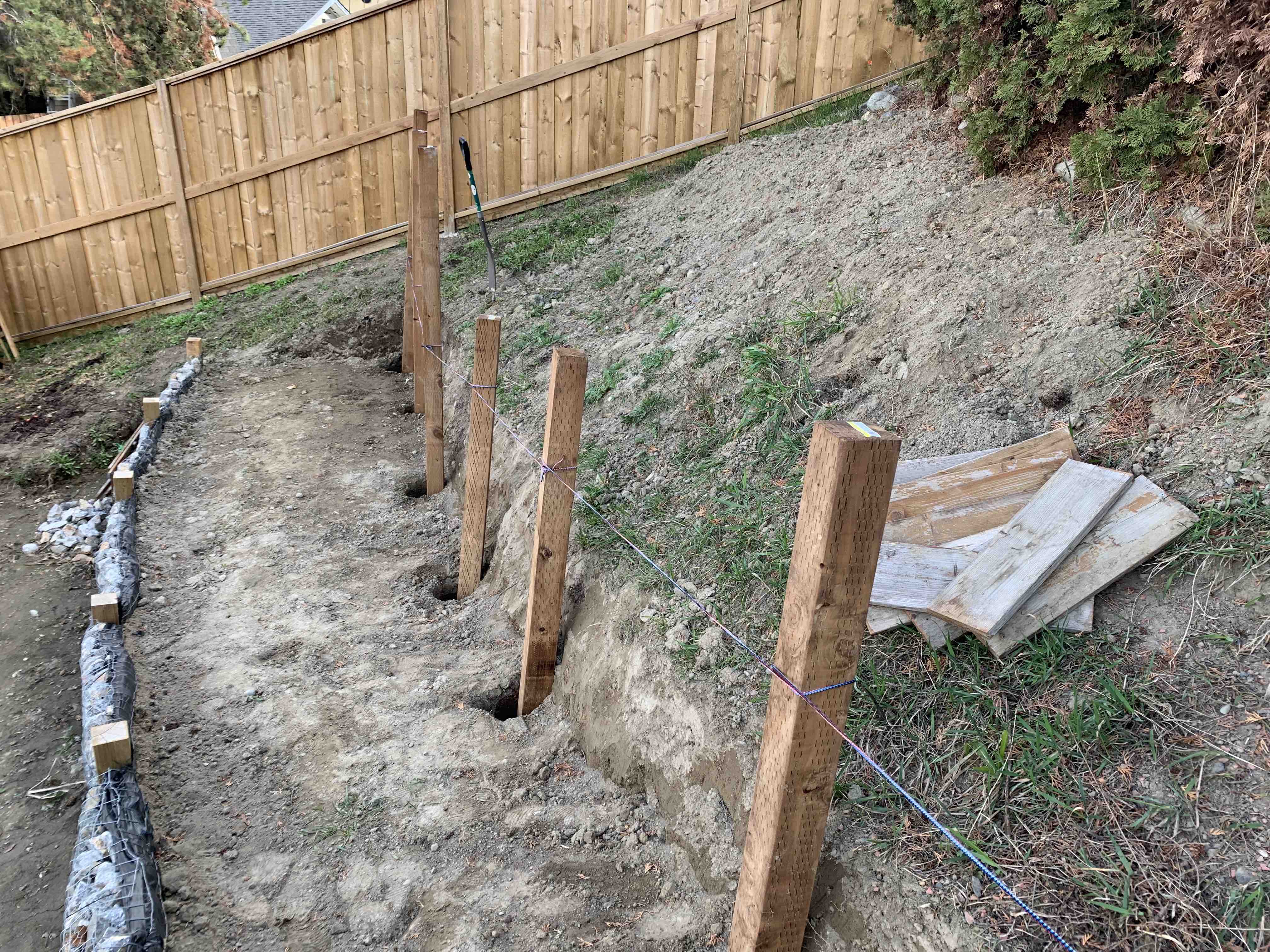The cementing went well, until we realized that one of the posts we had bought, had a huge crack down the centre. We discussed leaving it and cementing in that post another day, but the mixer and everything was setup, so we quickly ran to the building supply store to grab another post. By the time we were finished, we were mixing the last bucket of cement in the deep dusk of the evening in the light from our garage. We were able to see enough to get the last post cemented in. We gave them a few days to cure so that they were nice and solid. These posts are also a bit deeper than our past walls, and at more of an angle. This is a steeper section, and although the soil is solid and holds its form well, we don’t want to take any chances of one of these walls tipping on us. The tallest section is approx. 3′ tall, and we put them at least 2′ into the ground. Nice and solid.
