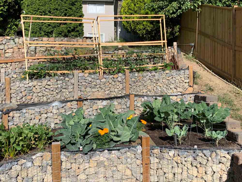 Our plants tend to get to be very tall, sometimes up to 9′ in height. When they did that last year, the flopped out of the top, creating quite a lean on the towers. Luckily the rock wall behind the towers is quite tall as well and provided support so that the towers did not tip over completely. They just had a drunken lean look to them for a good part of the summer.