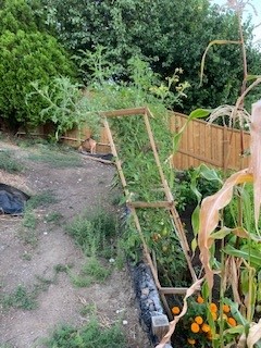 The towers that I built last year to help support the tomato plants were made from our old tomato towers and stood at approx. 6′ tall. once we had buried them into the ground for added support, they only stood about 5′ tall. They were made completely of 1″ x 2″ pieces of wood. This size wood worked fine when each tomato plant had their own tower, however, moving to the larger, multi-plant towers, the wood wasn’t strong enough to withstand the larger amount of weight.