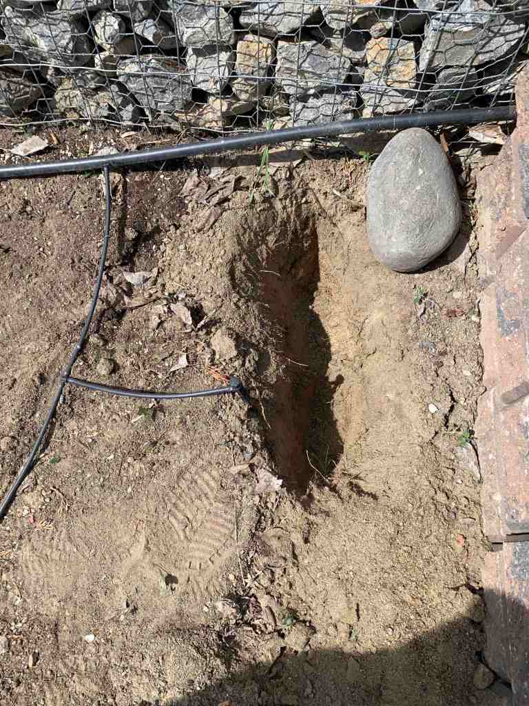 Once I had the 2 towers put together, I went and dug some trenches in the garden where the legs were going to go. I planned to put them at least a foot deep into the ground. I didn’t even mind if they went a tad deeper. Once I had the trenches dug, it was time to put the stands into the ground. That was fun, and had Kurt been home, I would have had him take a picture. They are pretty lightweight, so I could carry them by myself, they are just large and difficult to manoeuvre…but I managed, I just didn’t get a photo of how ridiculous it must have looked. Especially when it was time to lift them over the wall and lower them down into the trenches I had dug.