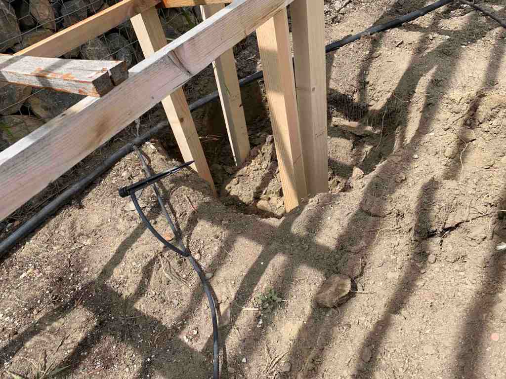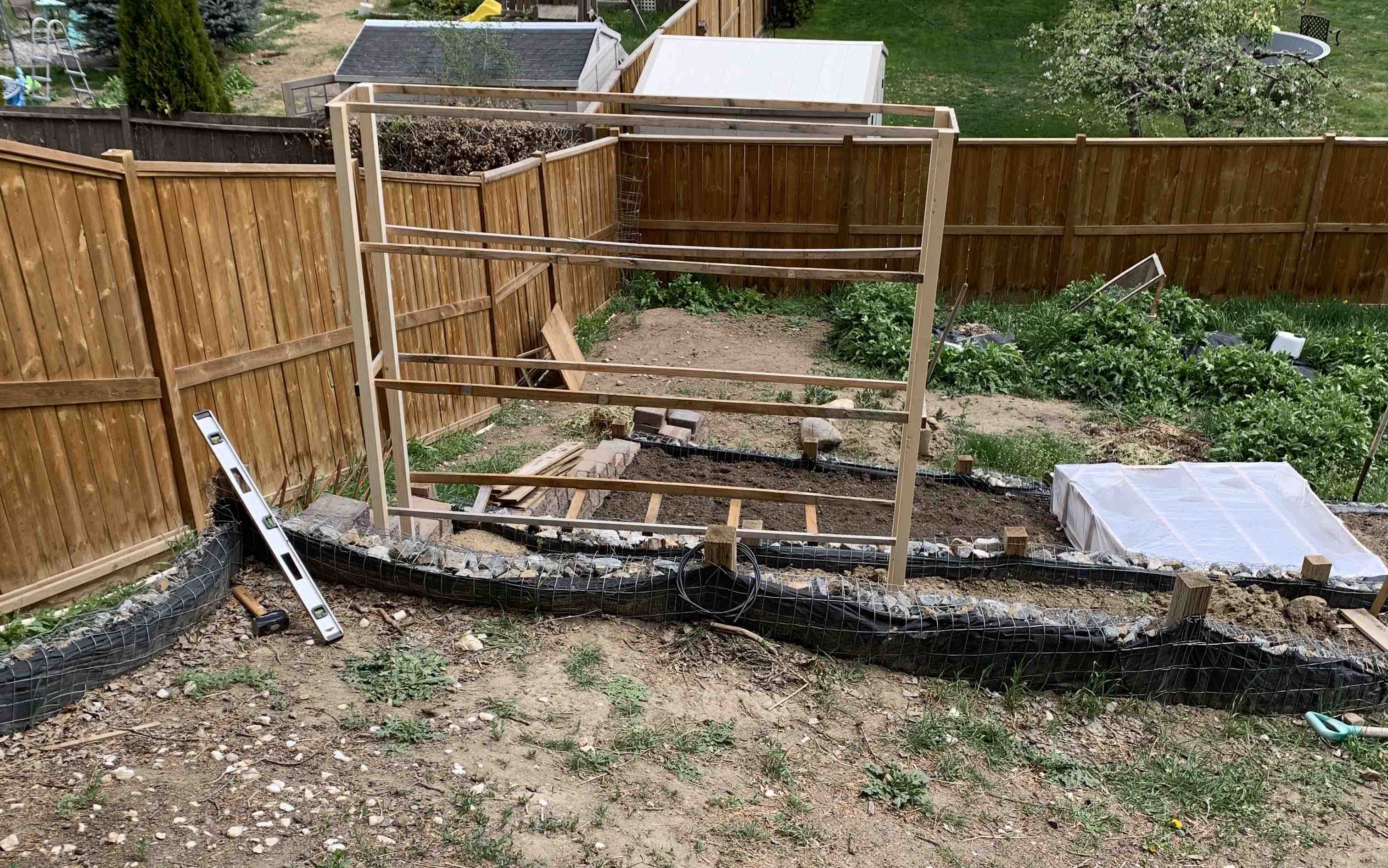 They were much bigger than I had envisioned. I am not sure why, I could clearly see how long my 2″ x 2″ x 8′ boards were, but they still shocked me a bit once I stood them up. I am sure if any of our neighbours were around, they were likely wondering what the heck I was working on. But at least I had a good amount of leg that could be buried in the garden to help give it stability.