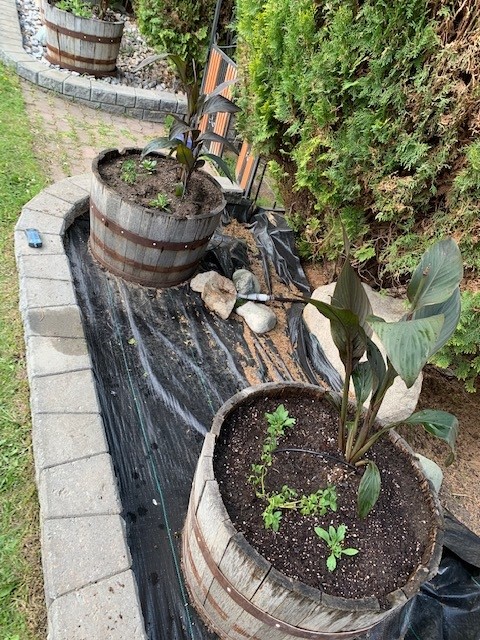 Next step was to start plunking our flowers into the barrels. Kurt had to re-fill 2 of the barrels because he had emptied them to put down landscaping fabric in preparation of making that area a rock garden as well. I got the canna lilies into the other 4 barrels while he did that. Then while I put the canna lilies into the 2 he had filled, he started putting out our wave petunias. I followed him and got them into the soil. 3 per barrel is plenty and they overflow beautifully. Kurt did a nice mix of yellow, white, and pink to go with the vibrant orange flowers of the canna lilies.