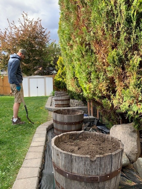 Once in, we tested the irrigation because it was out of commission all of last summer and we just had it repaired. It is so nice to have those on an automatic watering system again this year. That line also ties into our cedar bushes, which need regular watering. We have 2 that may be dead, but still have quite a bit of green on the lower yard side of them. Maybe we will be able to bring them back? I am doubtful, but we will try. I noticed they didn’t have a sprayer directly on them, so I made sure to add one in so that they get lots of water.