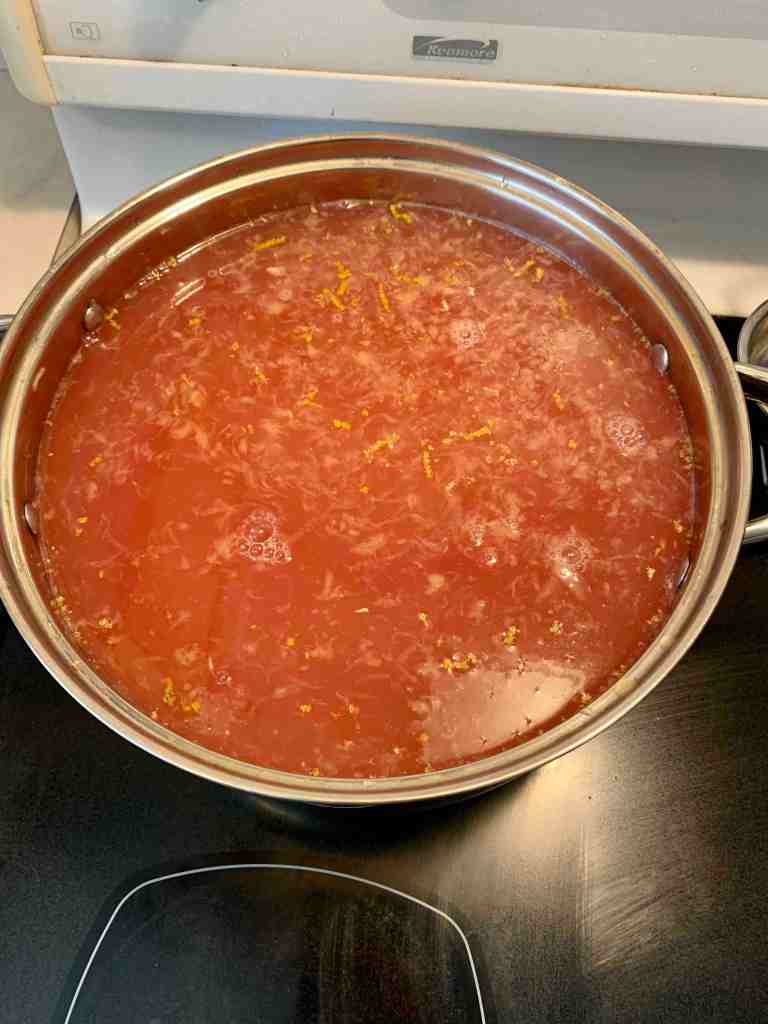 Pour your rhubarb juice into a pot. Add zest from the 4 lemons as well as the juice of those lemons.