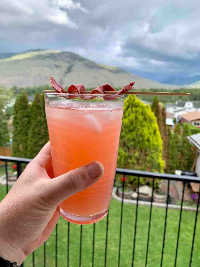If you have been following along with all 3 rhubarb recipes, then you likely have some fruit leather. Add some to a skewer as a garnish for the drink.