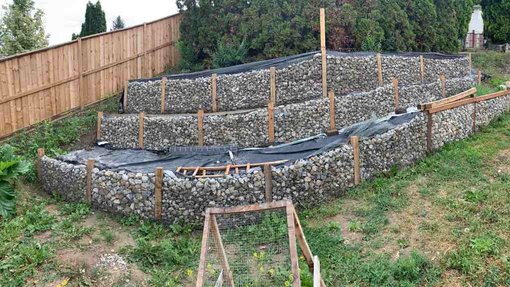 I would still like to get the tops wired up but wanted to let it sit for a week or so to see if it shifted or anything and would require any topping up. So far it looks like everything is good to go, so one cooler evening, I will get out there and wire the tops. Already I am worried about the excess landscaping material that we didn’t cut off the back. We left it to help save our arms, ribs and bellies as we reached over to do wire ties, but now it is likely a haven for spiders. The last time we left excess landscaping fabric on the back of one of the walls, the black widows moved in, making it a heevy-jeevy process of cutting it off. I will make sure I am wearing nice thick gardening gloves, and flip the excess over so that I can see the backside before I start cutting. Get anything out of the way that I need to.