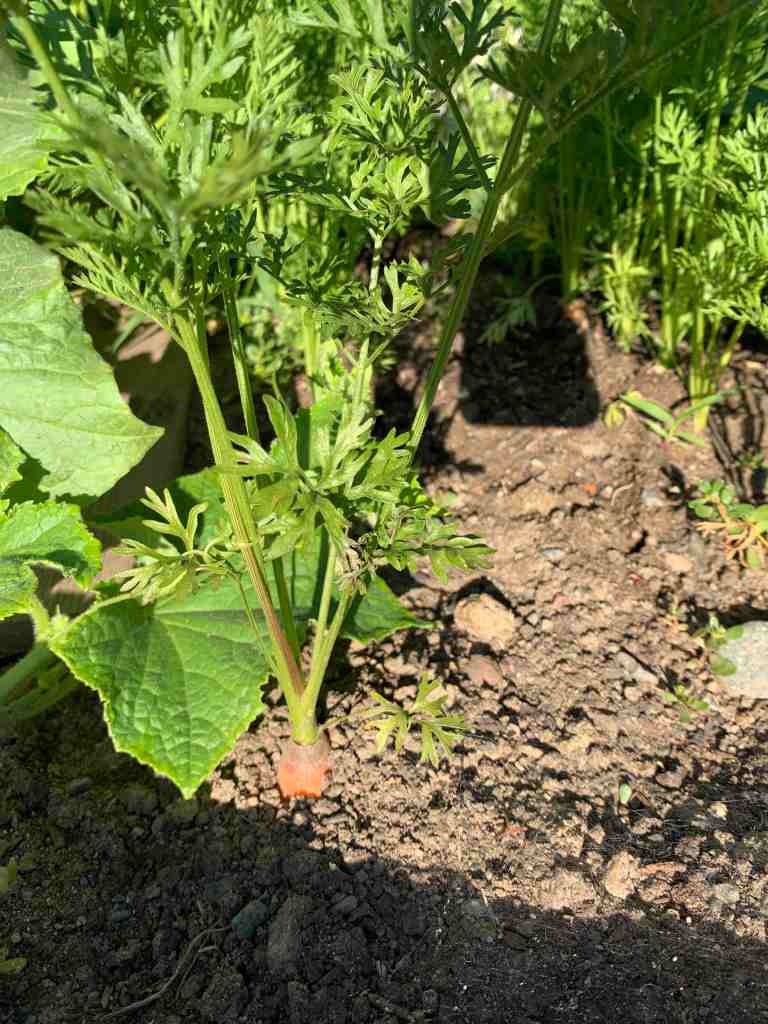 The carrots are the same as the beets. Definitely behind and only just showing a bit of shoulder. I think those will also be coming to something of a decent size in the next few weeks. I haven’t picked one to check yet, but based on the shoulder width, they still look a little lean. The dogs will be happy when we do start picking those as they are their favourite garden treat. We did a little less this year than we did last year, with the plan that if we start running low, then we will add rows in as we pick them for later season harvests. I will likely do the same with the beets. I like to can some for the winter months.