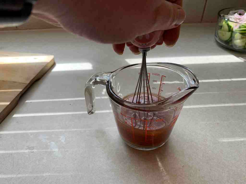 - Add the apple cider vinegar, sweet chili sauce, sugar, salt and pepper. Whisk to ensure well blended and that the sugar has dissolved.