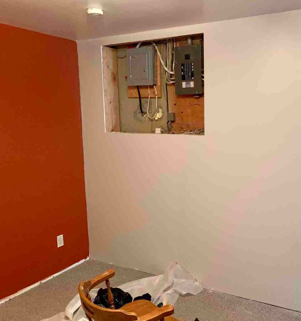 For quick reference of what I will be referencing in this post, below is the before (wood panelling wall) and after (drywall with open area around breaker boxes).