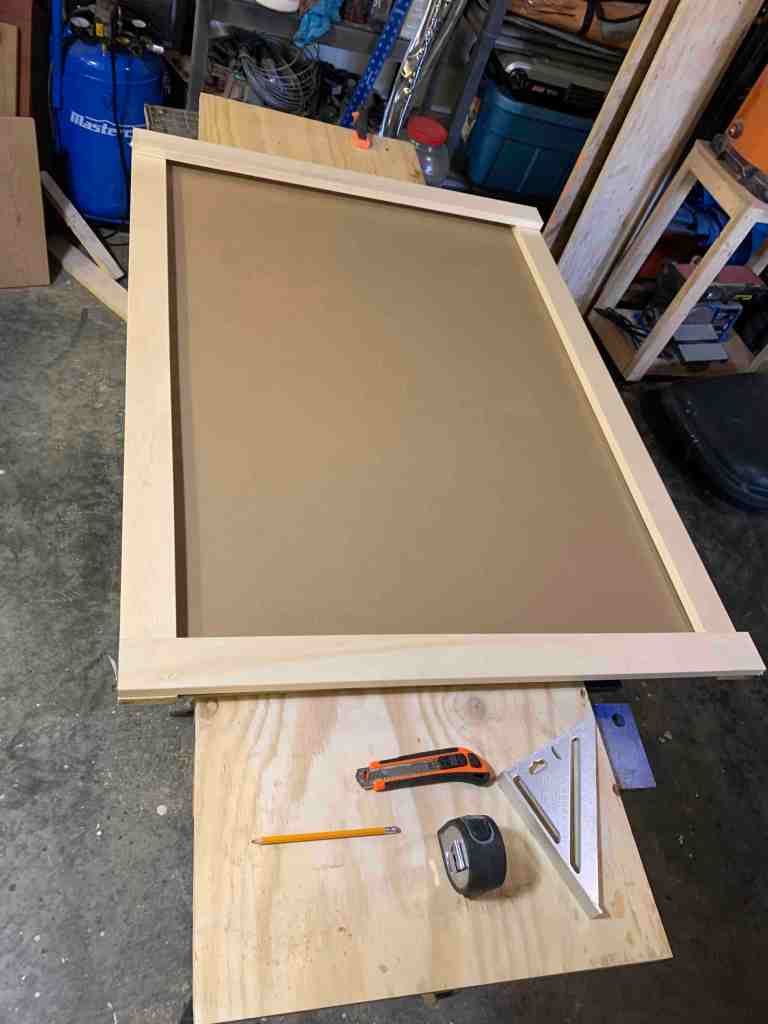 The frame was pretty simple. Using the 1′ x 6′ board, I cut the frame so that it would be the 46.5″ x 35″ I wanted it to be. I overlapped the boards so that I had some excess for when I cut the 45* angles for the corners.